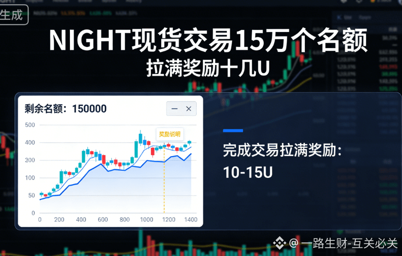 紧接着,币安又砸出了一个9000万枚NIGHT的现货交易活动奖池! 兄弟们,9000万枚啊!而且名额给得超级多,足足15万个名额,只要你参与,拉满奖励也有十几U。这还不算完,还能跟每个月的交易挑战赛叠加,一鱼多吃,#buff 叠满!