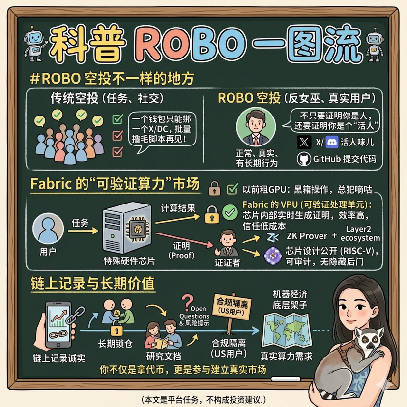 Dalam dunia cryptocurrency selama bertahun-tahun ini, saya sudah banyak melihat airdrop. Ramai memang ramai, tetapi jujur saja, proyek yang benar-benar membuat saya merasa menarik tidak banyak. Airdrop proyek @Fabric Foundation $ROBO kali ini bisa dianggap salah satunya. Kenapa? Karena semangat seriusnya, mempermainkan "anti-witch" ke tingkat baru. Sebelumnya, saat kita membicarakan anti-witch, paling tidak hanya meminta Anda untuk melakukan beberapa tugas, menyerahkan beberapa akun media sosial, untuk membuktikan bahwa Anda adalah manusia. Namun $ROBO kali ini, mereka tidak hanya ingin membuktikan bahwa Anda adalah manusia, tetapi juga ingin membuktikan bahwa Anda adalah orang yang "normal, nyata, dan memiliki perilaku jangka panjang". Singkatnya, berikut adalah aturan kali ini. $ROBO Total 10 miliar, 5% diambil untuk airdrop komunitas, dan akan dibuka saat diluncurkan. Jendela pendaftaran sangat singkat, hanya dari tanggal 20 hingga 24 Februari, Anda perlu menghubungkan dompet, mengikat akun X, DC, dan GitHub Anda, serta memilih rantai penerima. Perhatikan, jika sudah memilih, tidak bisa diubah, satu lobak satu lubang. Yang paling penting adalah: satu alamat dompet hanya bisa mengikat satu akun X atau DC. Langkah ini langsung menghalangi skrip yang melakukan pengambilan massal. Kemudian, ada mekanisme anti-witch yang mereka banggakan. Bagaimana cara menentukan apakah Anda adalah manusia nyata? Bukan dengan melihat apakah Anda memiliki akun, tetapi dengan melihat apakah akun Anda memiliki "rasa manusia hidup". Misalnya, apakah akun X Anda dari awal pendaftaran terus-menerus mengirimkan hal-hal yang tidak berguna? Apakah GitHub Anda pernah mengirimkan kode yang serius? Apakah Anda menghabiskan waktu di DC selama bertahun-tahun tanpa pernah muncul atau sesekali berbicara? Data-data ini secara keseluruhan membentuk gambaran "peserta yang nyata". Platform yang mereka kerjasamakan seperti Kaito, Surf, melakukan hal ini. Ketika saya pertama kali melihat aturan ini, reaksi pertama saya adalah: hei, bukankah ini adalah manfaat bagi "investor lama" yang setiap hari berselancar di internet dan diam-diam berkontribusi dalam proyek? Biasanya, kami yang "banyak bicara" akhirnya memiliki tempat untuk berkontribusi.