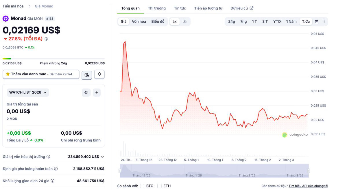 Ngoài trừ một đợt tăng trưởng nóng ngay đầu TGE (theo kinh nghiệm của mình thì dự án, Coinbase cố gắng đẩy giá $MON để đợt bán Pre Sale không quá drama) thì $MON đã giao động quanh mốc $0.02 tương đương với mức định giá 2 tỷ đô từ đầu tháng 12 cho tới nay.