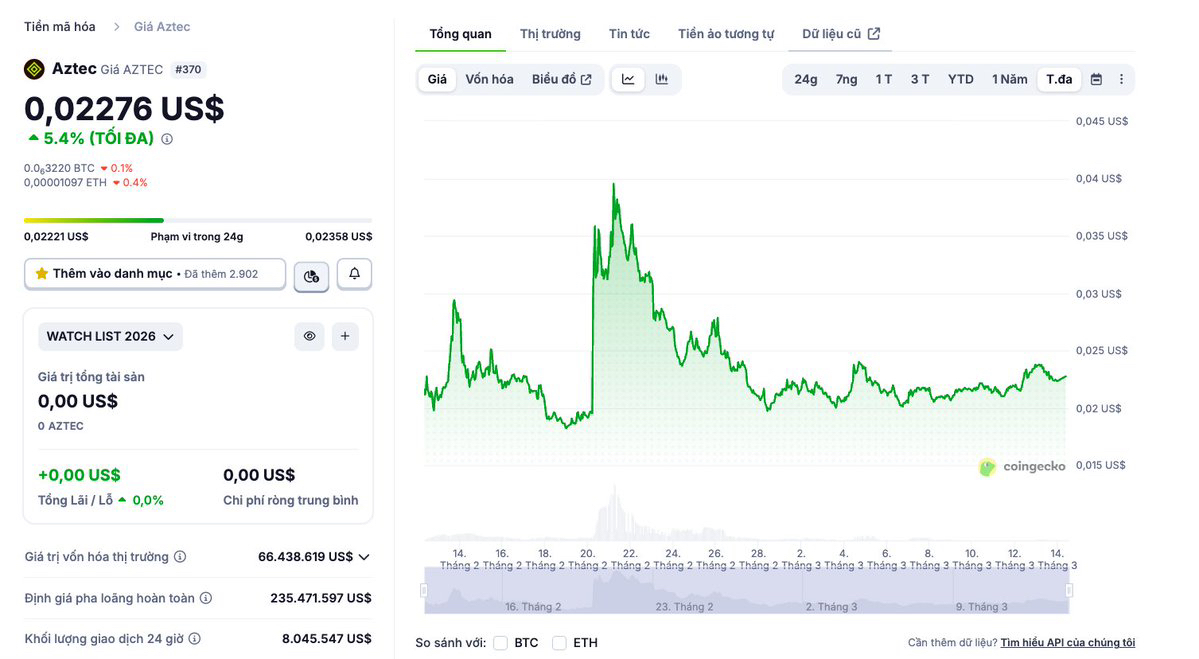 Giá $AZTEC luôn giao động quanh mốc khoảng $0.022 (cộng trừ khoảng 10 - 15%) kể từ thời điểm TGE là đầu tháng 2/2026 tới nay trong khi đó trong khoảng thời gian này giá $BTC tương đối tiêu cực.