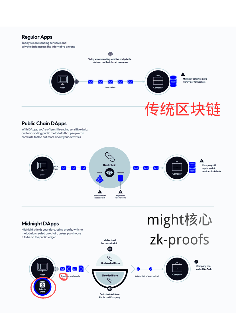 參考官方的技術對比圖,傳統 DApps 往往需要將敏感數據傳輸到鏈上,這本質上創造了無數個「數據黑洞」。而 Midnight DApps 的邏輯截然不同:用戶在本地生成證明,鏈上只驗證證明的有效性,而不觸碰原始數據。這種「隱私數據留在本地,驗證結果上鏈」的架構,解決了機構級應用最擔心的隱私洩露問題。