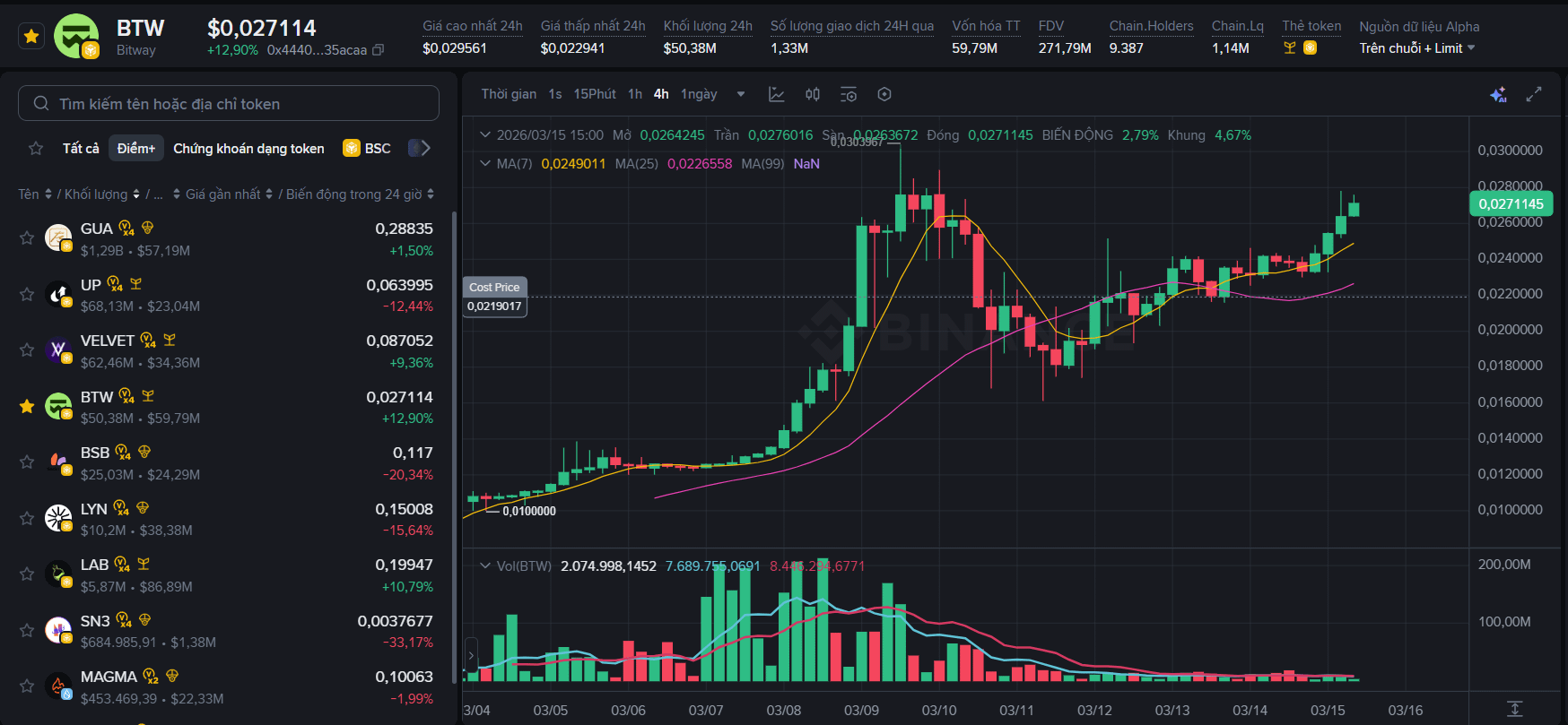 Dựa trên dữ liệu biểu đồ 4 giờ ngày 15/03/2026, token BTW (Bitway) đang thể hiện một cấu trúc giá khá thú vị và đáng chú ý sau giai đoạn điều chỉnh.