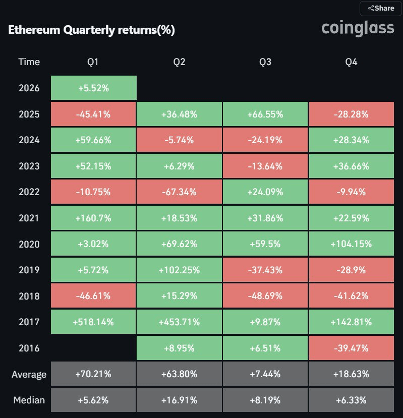 Setiap kali$ETH telah mengalami Q4 merah, Q1 berikutnya selalu hijau