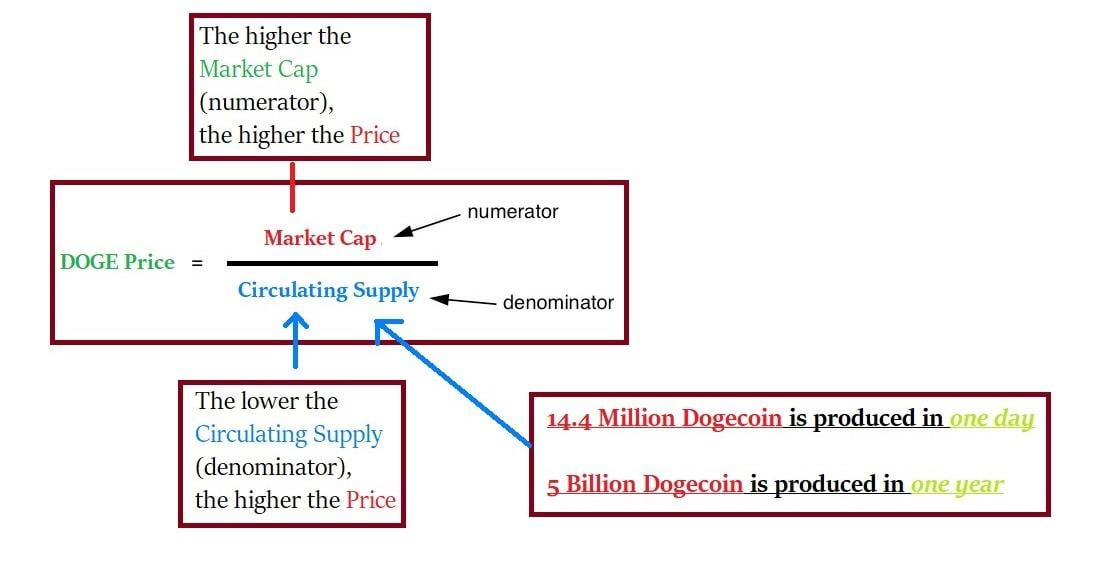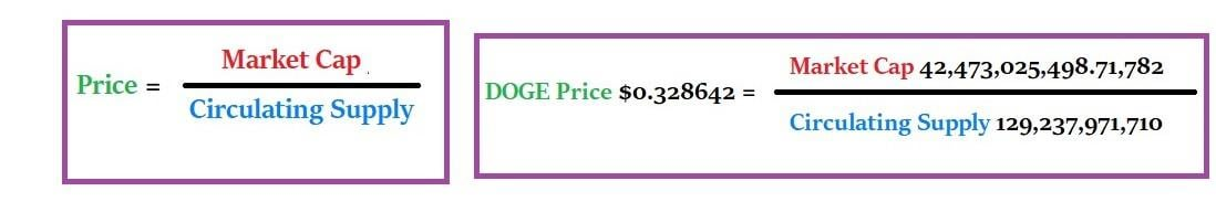 Quando Dogecoin era a 0,7 dollari (alcuni mesi fa), ho calcolato quanto segue per illustrare come funziona il suo prezzo in relazione alla capitalizzazione di mercato e all'offerta circolante.