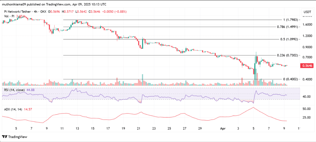 Tuttavia, il quadro non era completamente cupo. L'Indice Direzionale Medio (ADX) è recentemente sceso, mostrando un indebolimento del momentum rialzista. Se il prezzo del token Pi supera la successiva resistenza di $0.73, contrassegnata dal livello di ritracciamento di Fibonacci del 23.6%, potrebbe seguire un rally temporaneo. Gli investitori che monitorano il movimento tecnico credono che superare questa soglia potrebbe suscitare un nuovo slancio, principalmente con l'aumento dei casi di supporto per una tendenza rialzista sostenuta.
