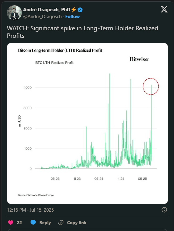 Nel frattempo, André Dragosch, responsabile della ricerca in Europa di Bitwise, ha osservato un significativo picco nei profitti realizzati dai detentori a lungo termine, spiegando la correzione in corso.