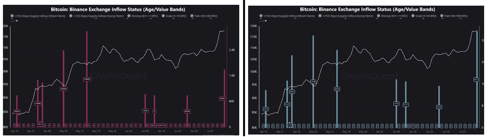 Questo aumento nei depositi suggerisce che gli investitori su larga scala si stanno preparando a garantire guadagni dopo il corsa storica a $122.000 o stanno pianificando di utilizzare la profonda liquidità di Binance per coprire o aprire nuove posizioni in mezzo alla massima volatilità, ha spiegato l'analista, aggiungendo: