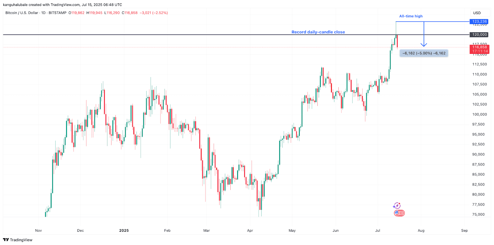 è tornato a rendimenti negativi poiché il suo prezzo è sceso del 5% a $116.850 martedì. Il rifiuto del prezzo è avvenuto a $120.000, il più alto closing di candela giornaliera mai registrato, e ora un livello chiave per i trader.