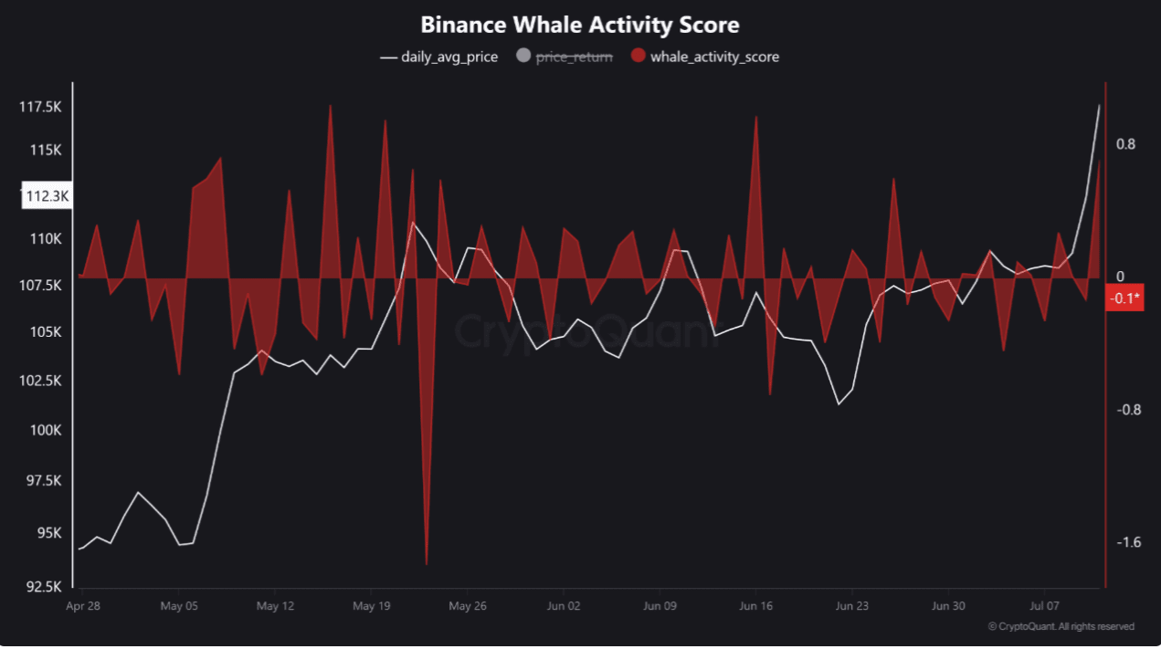 Secondo l'azienda, il punteggio di attività delle balene di Binance ha registrato un forte aumento dopo i massimi storici del Bitcoin di $122.000. Il punteggio di attività delle balene di Binance traccia il comportamento dei grandi detentori di Bitcoin (balene) su Binance, il più grande scambio al mondo. Un punteggio elevato indica che le balene stanno guidando una parte sostanziale dell'attività su Binance.