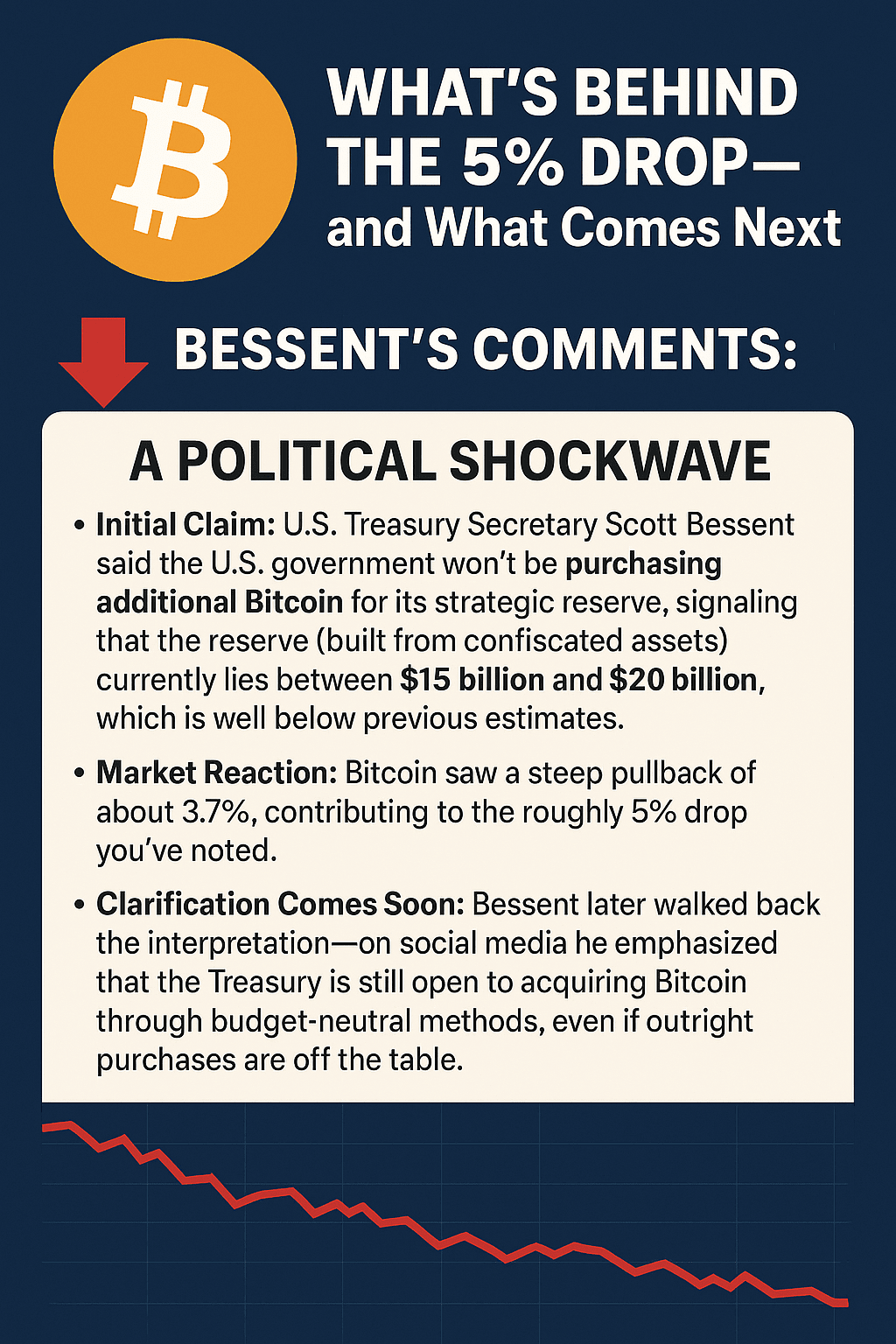 Il ribaltamento ribassista del bitcoin avviene mentre il segretario del Tesoro degli Stati Uniti Scott Bessent ha rivelato che gli Stati Uniti detengono molti meno bitcoin di quanto si pensasse in precedenza, ponendo le riserve di bitcoin del governo a soli "$15 miliardi a $20 miliardi", ben al di sotto delle stime precedenti di oltre $23 miliardi.