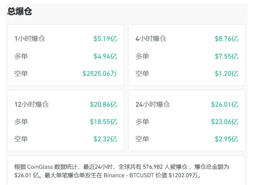 • Culmine della liquidazione: 2,6 miliardi di dollari di liquidazioni si sono verificate sulla rete, spazzando via 570.000 investitori. La più grande liquidazione singola si è verificata sui contratti perpetui BTC di Binance, per un valore di 12 milioni di dollari. Questo è un tipico sintomo dello scoppio improvviso della bolla della leva finanziaria.