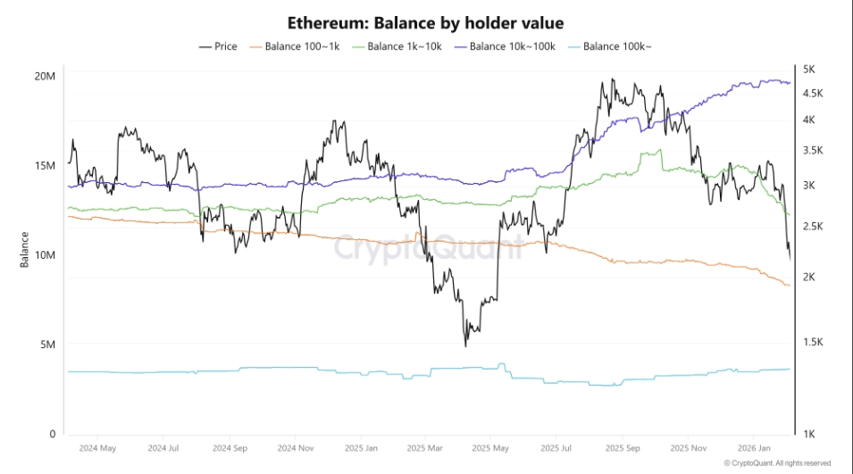 5. Segnale di divergenza in ETH: nonostante il calo in linea con il mercato, i dati on-chain mostrano che gli indirizzi whale (che detengono oltre 10.000 ETH) continuano ad accumulare, mentre i detentori di piccole e medie dimensioni stanno vendendo. Ciò potrebbe indicare una divergenza tra "smart money" e "panic selling".