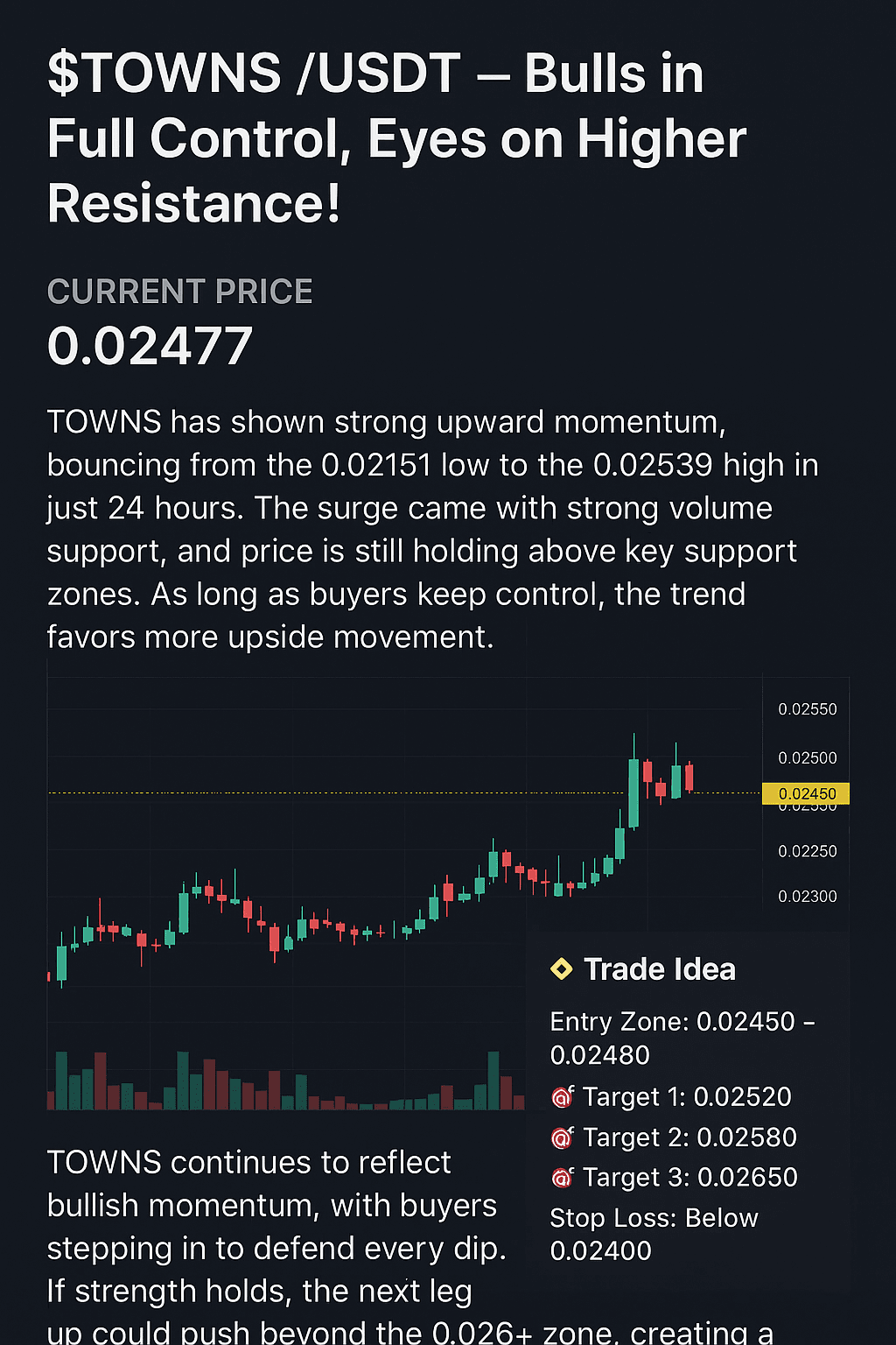 $TOWNS continua a riflettere una momentum rialzista, con i compratori che intervengono per difendere ogni calo. Se la forza si mantiene, la prossima gamba al rialzo potrebbe spingersi oltre la zona di 0.026+, creando una nuova opportunità long per i trader. 📈🔥