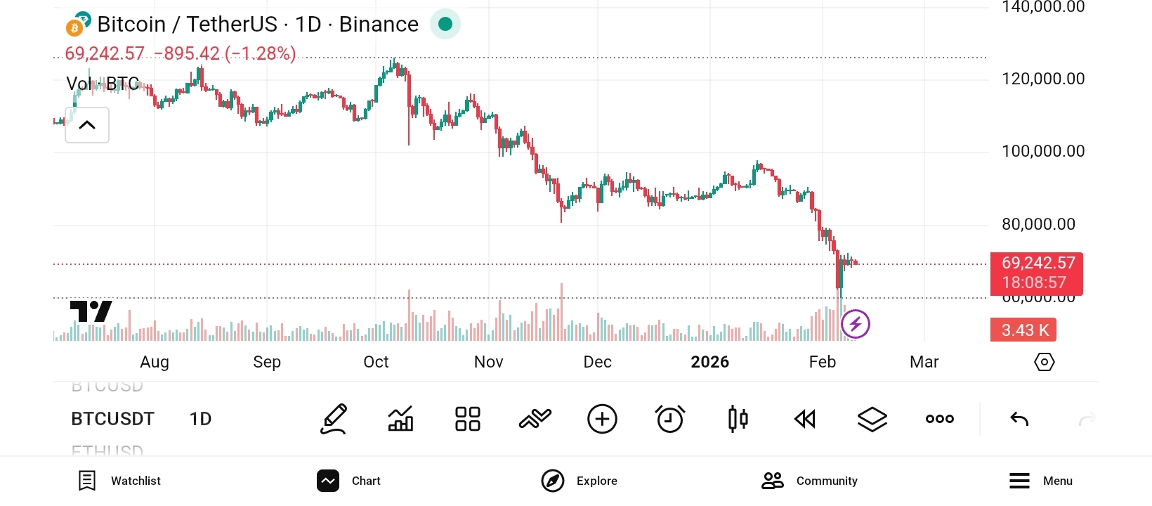 On the 1‑day time frame, the move from about 97,000 in early January to the low‑70,000s in February looks like a sharp but normal correction after a strong run. Candles over the last several days show price trying to stabilize rather than continuing straight down, which often marks the early stages of a new base.