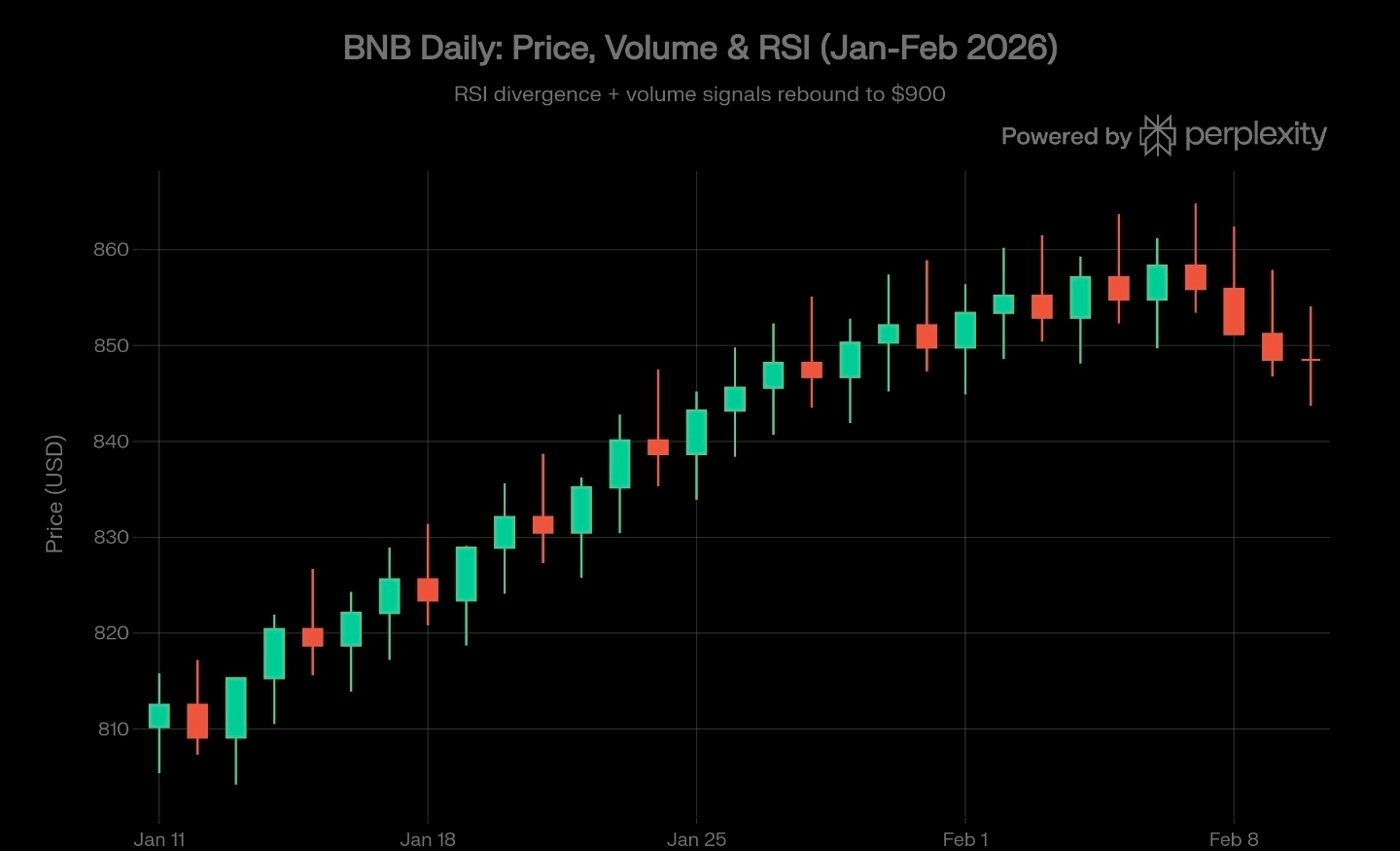 king at the daily chart from January through February 2026, the price action for BNB shows a classic ascending trend with a series of higher highs and higher lows. Starting from the $810 level in mid-January, the asset staged a disciplined climb, peaking near $860. However, the most critical signal for traders right now is the RSI divergence visible on the daily timeframe. While the price reached local peaks in early February, the momentum began to flatten, a signal that often precedes a consolidation phase before the next major leg up.