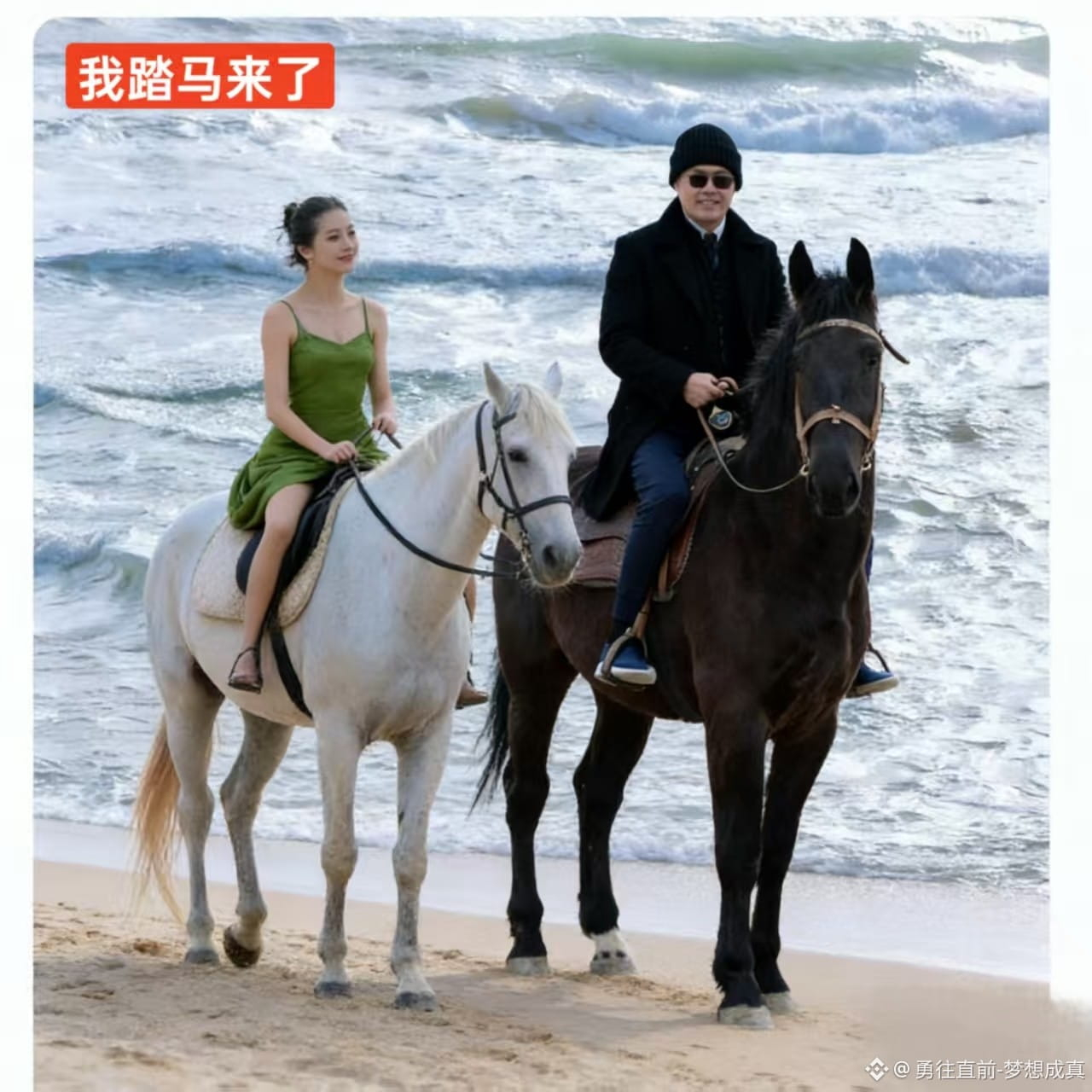 这海岸上的“王子与公主”,从来不是身份的加冕,而是状态的象征。是历经岁月,依然保有温柔与坚定的能力;是面对风浪,依然拥有并肩同行的默契;是新的一年,敢于以“踏马而来”的姿态,迎接每一场挑战。海浪拍岸,是命运的鼓点;骏马嘶鸣,是梦想的号角。2026年的风,已经吹到了海岸边,吹起绿裙的褶皱,吹起黑马的鬃毛,也吹进了我们渴望突破的心底。