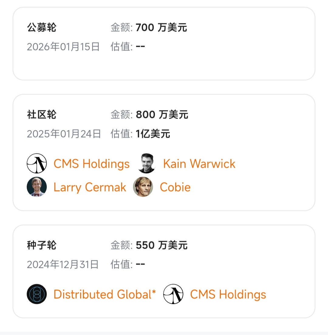 Guidato dalla società di investimento Distributed Global, che si concentra sull'ecosistema blockchain e sugli asset digitali, include anche società di investimento come CMS, che investono principalmente nell'ecosistema degli asset crittografici, insieme a nomi noti del settore come Kain Warwick, Cobie e Larry Cermak.