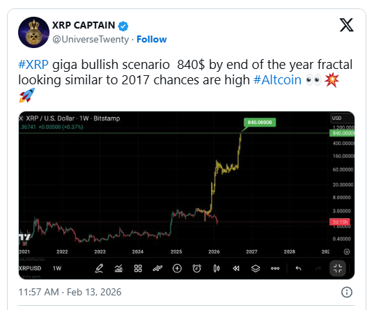 $XRP is showing signs of a major bullish trend according to the latest chart shared by crypto analyst XRP Captain (@UniverseTwenty). The chart projects a $840 price target before the end of the year. This highlights a fractal pattern reminiscent of XRPâs 2017 performance.