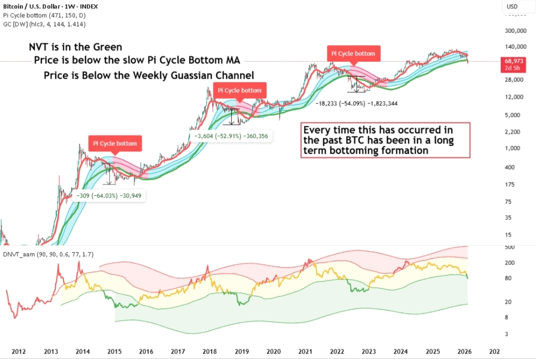 🟢 Price Below Weekly Gaussian Channel — Major hands are likely buying when BTC is trading below this channel, another classic accumulator behavior.