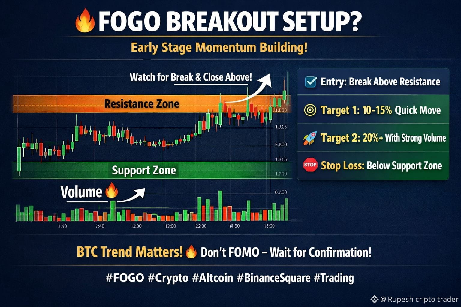 $FOGO $BTC showing strong volatility after recent exchange attention. Volume spike indicates short-term trader interest. If price sustains above key resistance zone, we could see a quick momentum push.