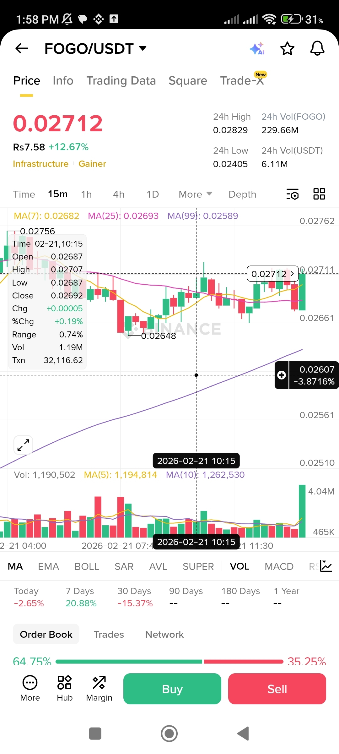 Looking at the 15-minute chart, FOGO successfully tested the support level around 0.02648 and bounced back strongly. The increasing green volume indicates high buying pressure, which is a very positive sign for short-term traders. The price is currently staying above the MA(7) and MA(25), suggesting that the trend is shifting towards the upside.