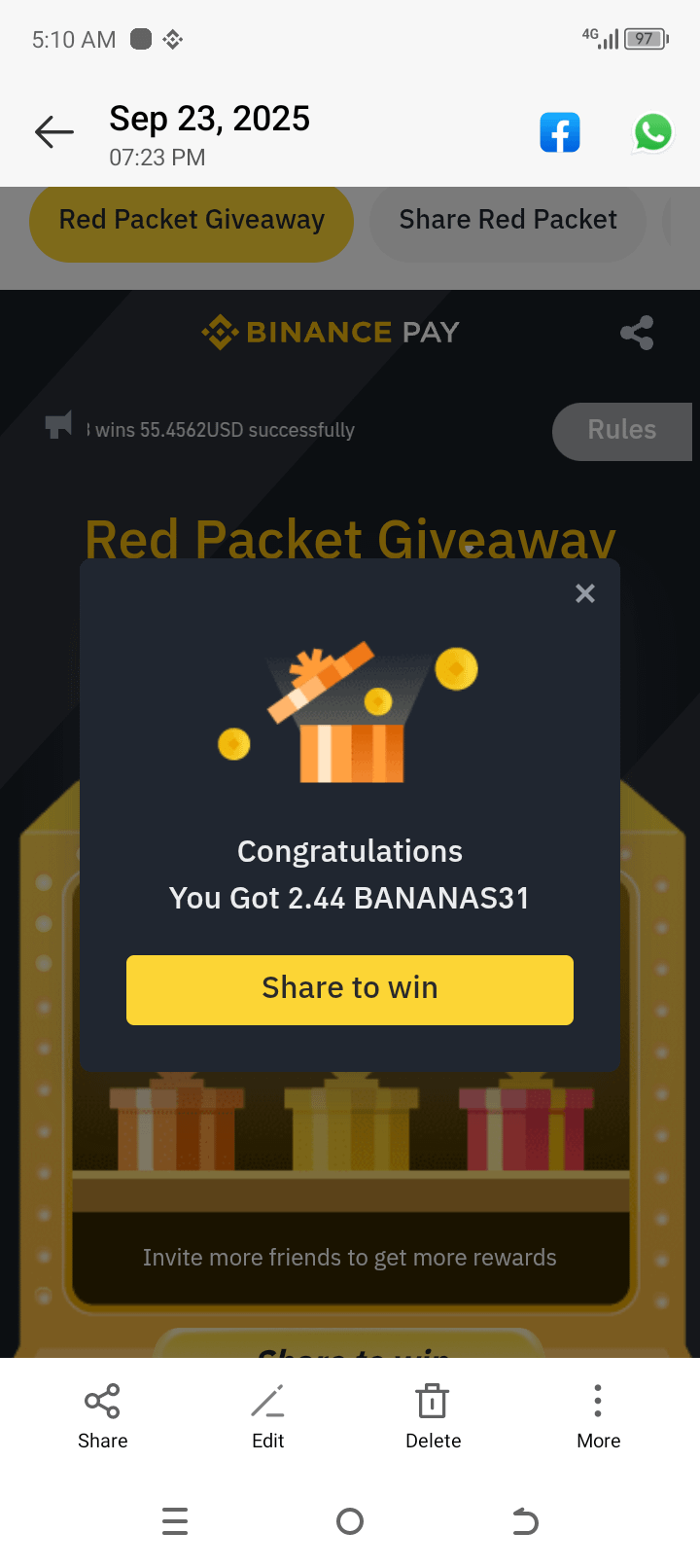 Today I successfully received 2.44 $BANANAS31 from the Binance Pay Red Packet Giveaway event 🟡🍌