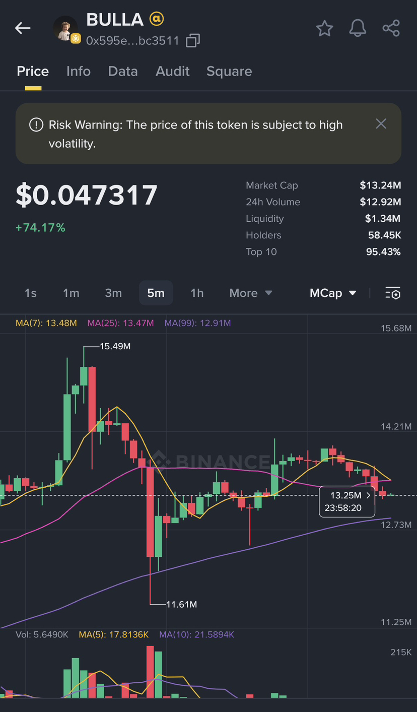 $BULLA is currently trading at $0.047317 (+74.17%) with a market cap of $13.24M. But beneath the green candles lies a dangerous structure every trader must understand.
