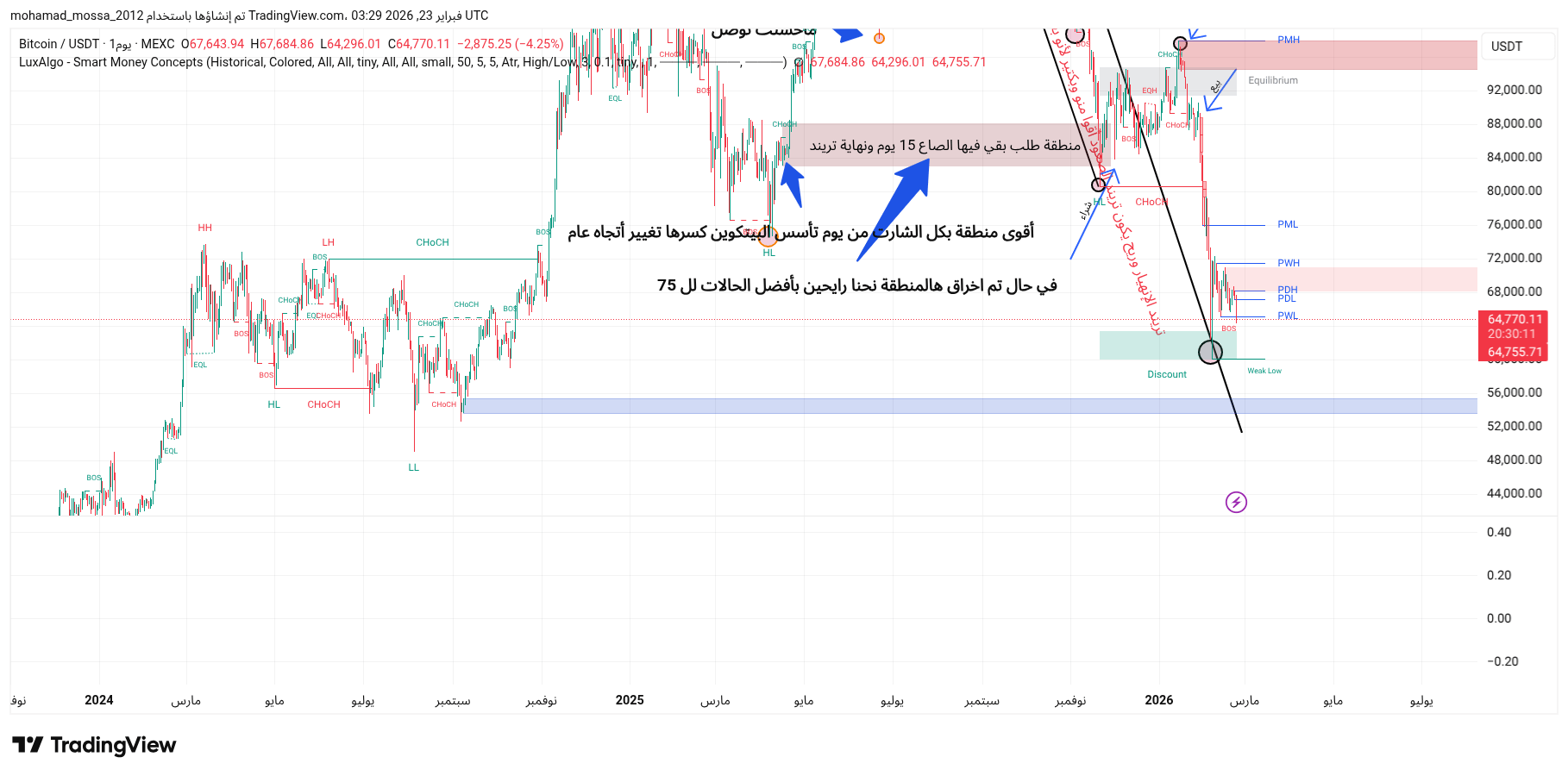 فنيًا، طالما السعر يتداول تحت منطقة 68–70 ألف ويُظهر ضعفًا في الارتدادات، يبقى سيناريو الهبوط قائمًا.