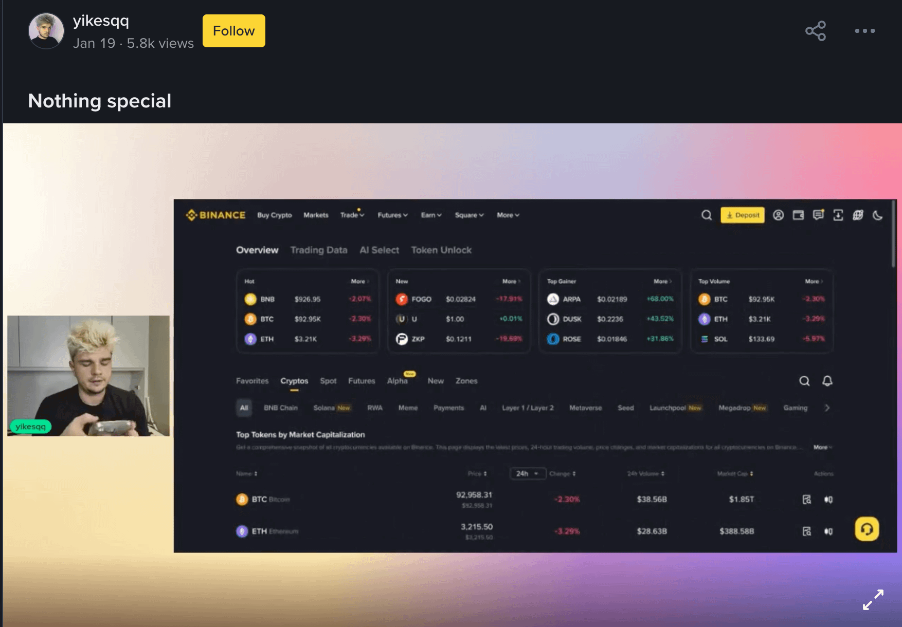 Condividi la pagina di trading di Binance, TradingView o qualsiasi strumento analitico per mostrare i tuoi veri movimenti di trading ai tuoi spettatori.