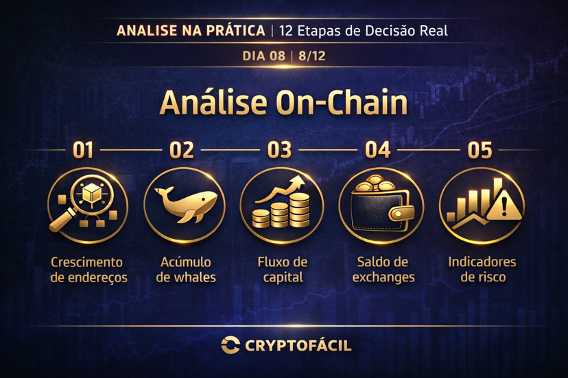 On-chain significa analisar dados registrados diretamente na blockchain, transações, carteiras, movimentações e atividade real da rede.