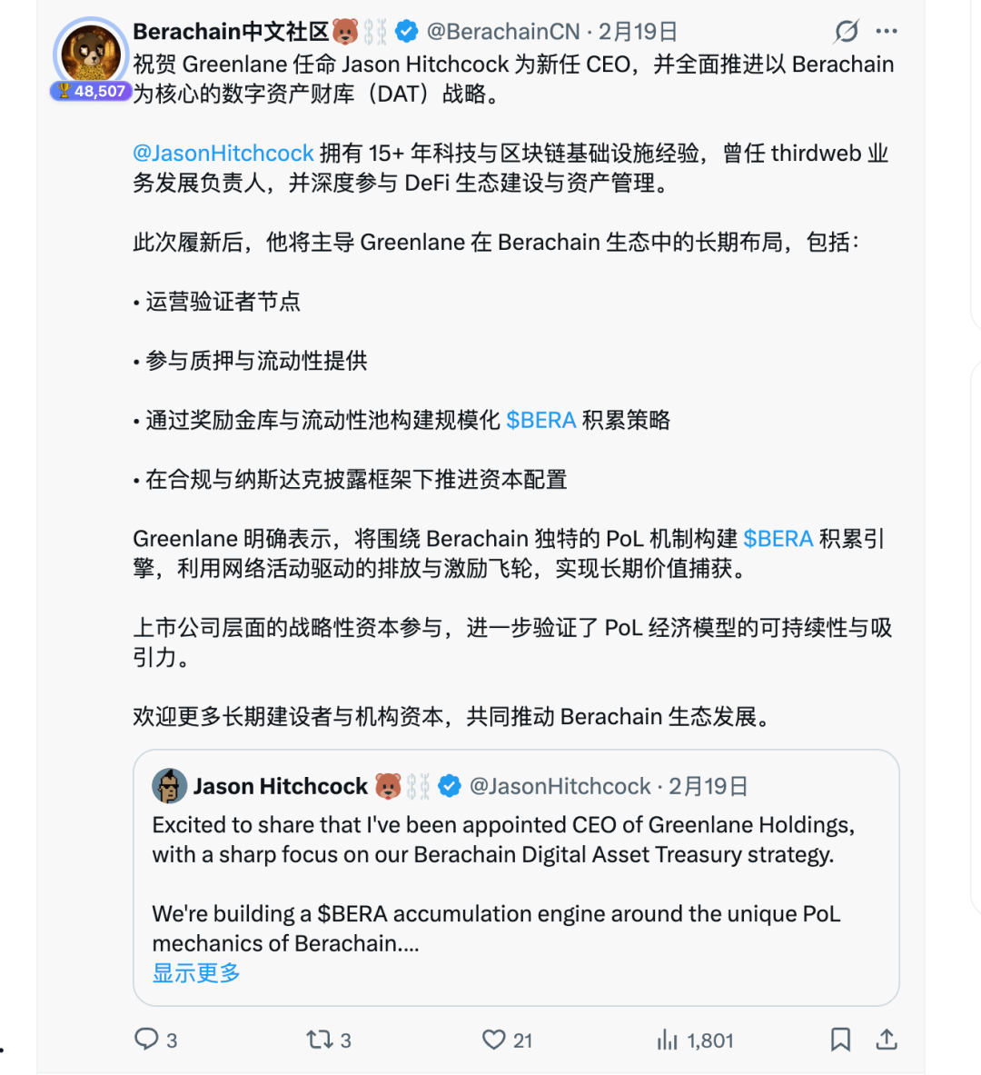 La risposta potrebbe risiedere nel fatto che Greenlane ha scoperto un percorso di valorizzazione degli asset più efficiente del semplice 'accumulo di monete', cioè diventare un operatore del protocollo. Partecipando attivamente ai nodi di validazione di Berachain, ai premi e ai pool di liquidità, Greenlane sta trasformando se stessa da 'investitore' a 'super nodo' all'interno di questa economia decentralizzata.
