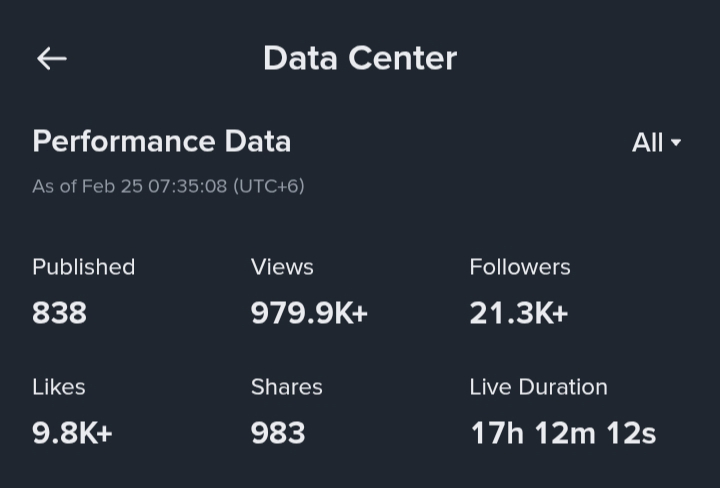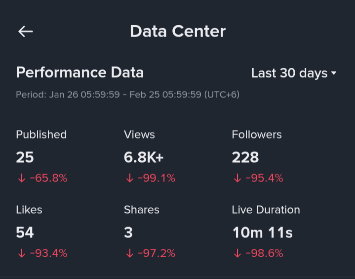 As per my last 30 days of data, I can clearly see that my views, likes, shares, and followers are decreasing significantly.