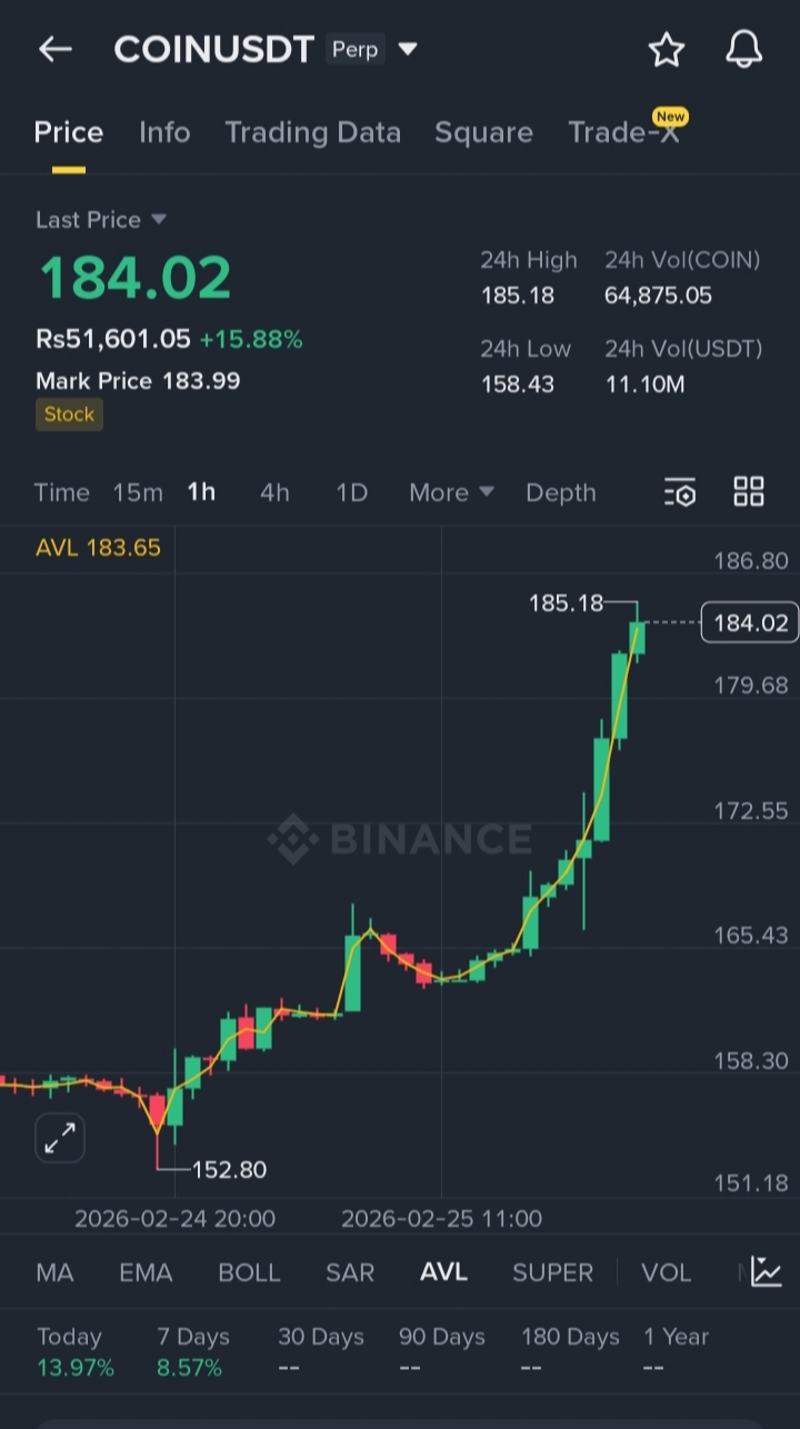 $COIN ha dato un grande breakout e in questo momento sta scambiando vicino al suo livello massimo di 24 ore ($185.18). Gli indicatori (linea AVL) mostrano che il momentum è ancora nelle mani degli acquirenti.