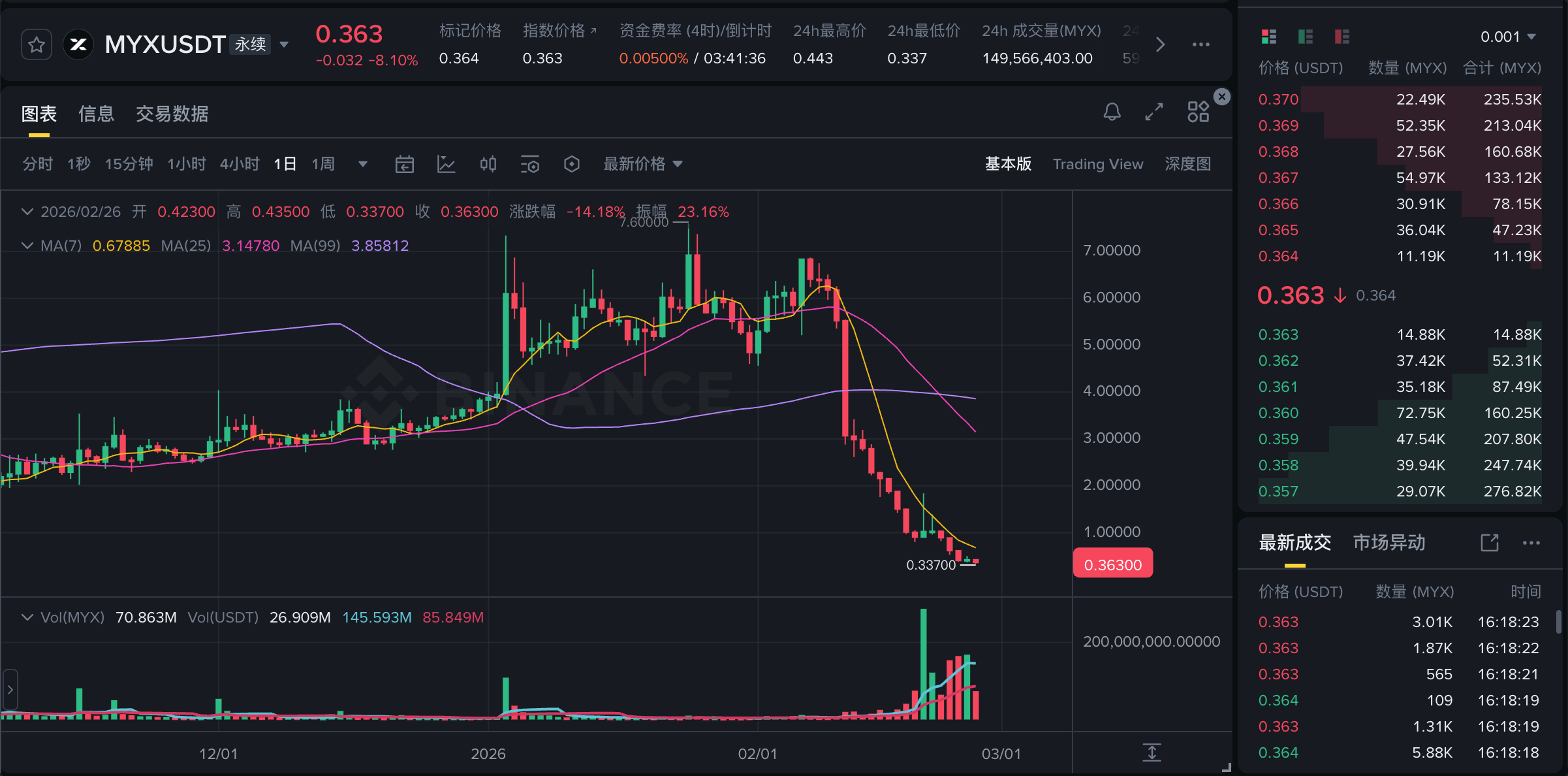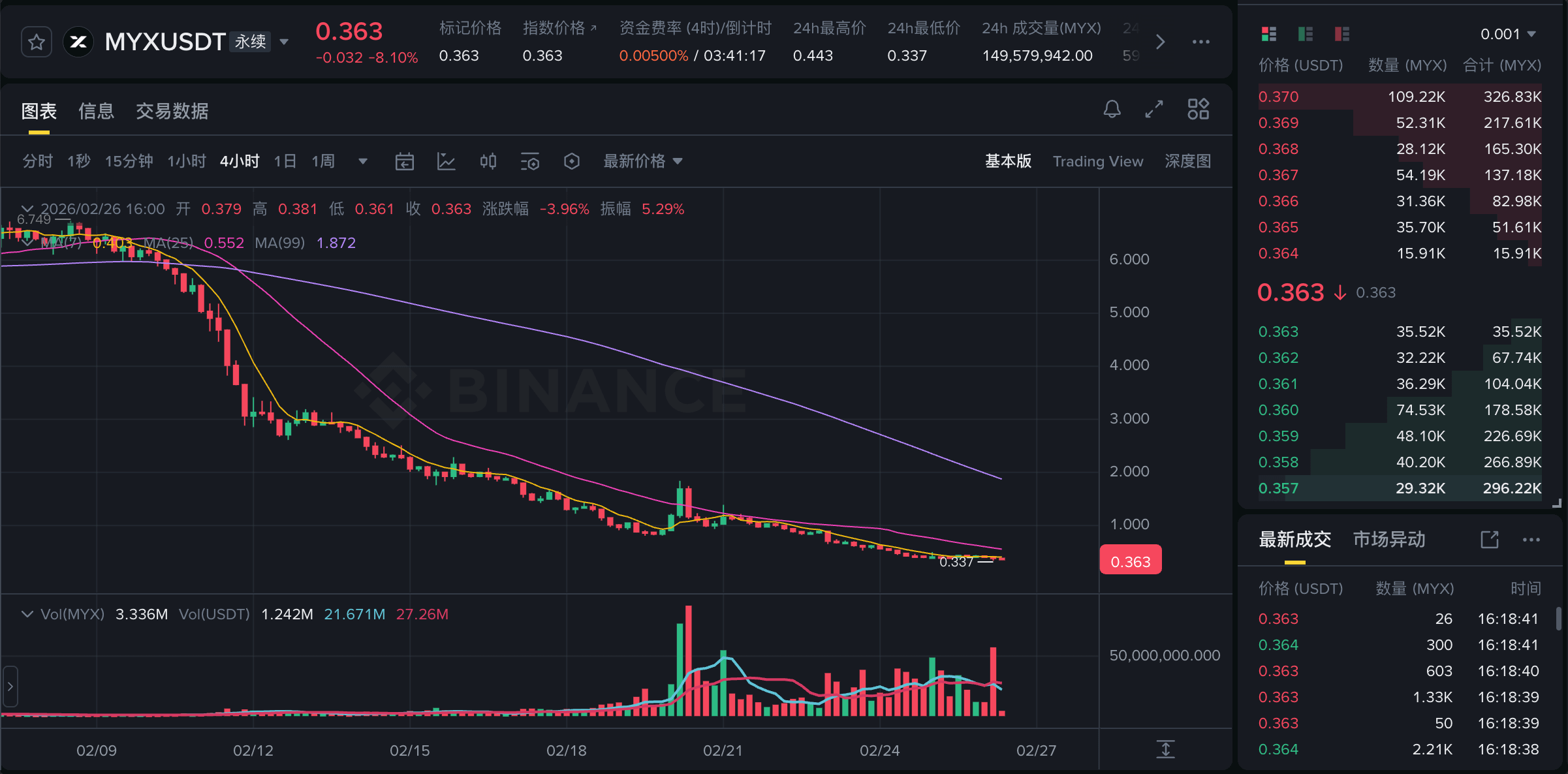 目前 $MYX (MYX Finance) 正处于一个 “共识崩塌后的价值真空与投机泡沫的彻底脱水” 的极端博弈阶段。结合目前的日线图、4 小时图、-0.00500%(且正在收敛)的资金费率以及最新的机构融资动向,以下是对 $MYX 接下来走势的深度分析: