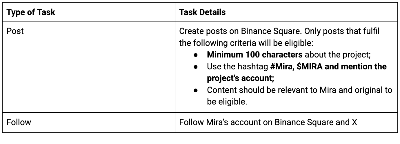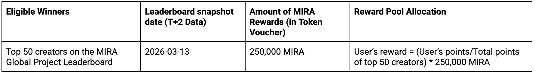 Gli utenti idonei sono classificati in base ai risultati della classifica per qualificarsi per il pool di premi di 250.000 MIRA, come da tabella sottostante.