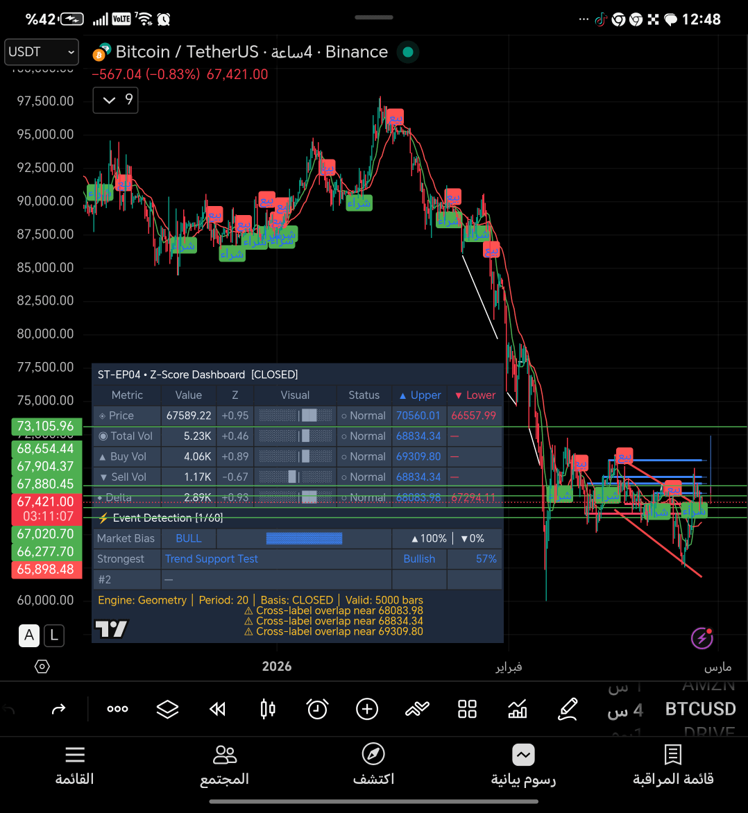 - الاتجاه العام: كان صاعد قوي (من ~60k إلى قمة ~97-98k سابقاً)، ثم تصحيح هابط حاد (من القمة إلى ~67k الآن)، لكن السعر يقترب من خط الدعم الأحمر/الأزرق (Trend Support) حول **66,500 - 67,000** تقريباً.