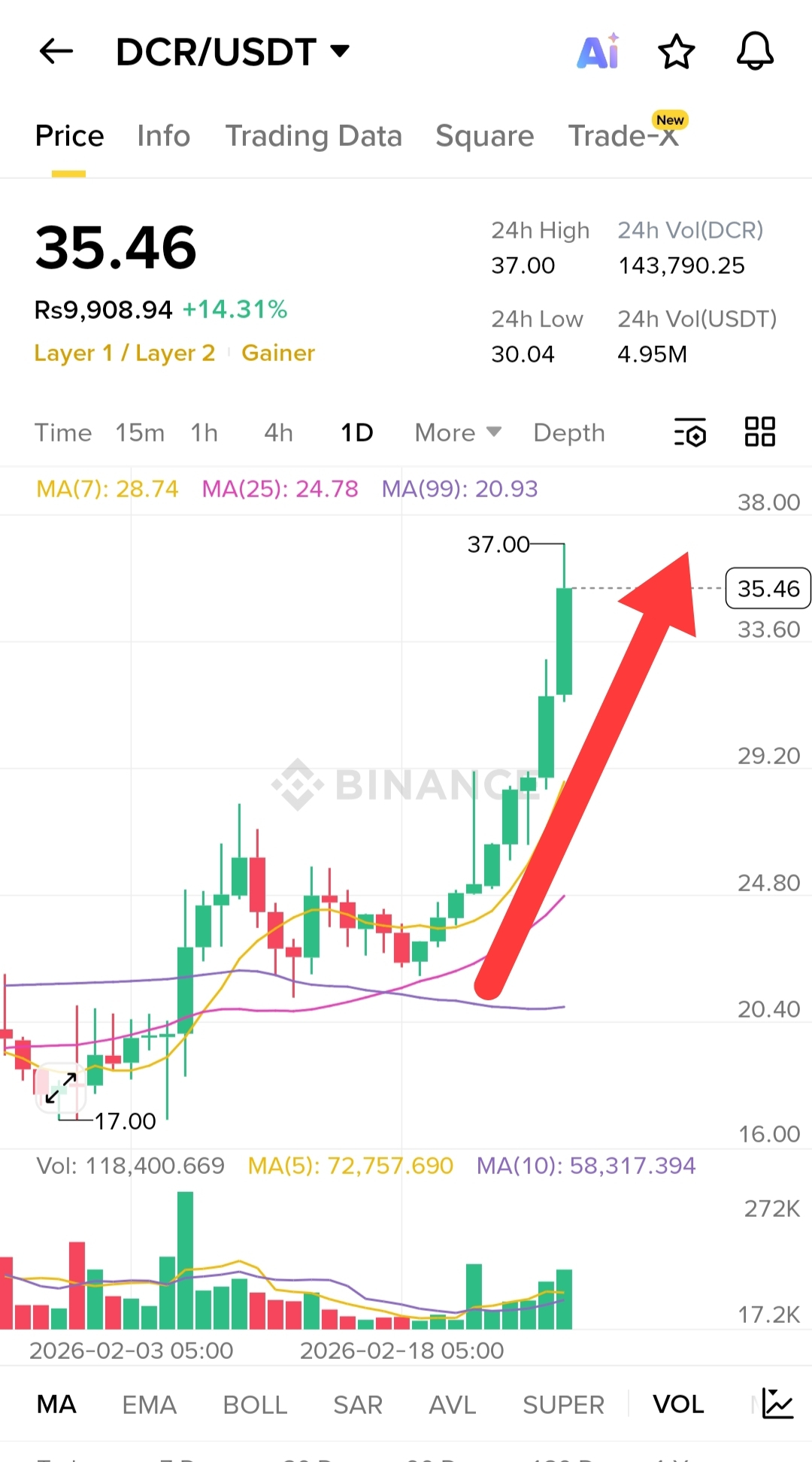 Exponential Momentum: The daily chart shows a "God Candle" structure. DCR has sliced through the MA(7), MA(25), and MA(99) with significant volume, indicating that this move is backed by strong buying interest rather than just a low-liquidity spike.