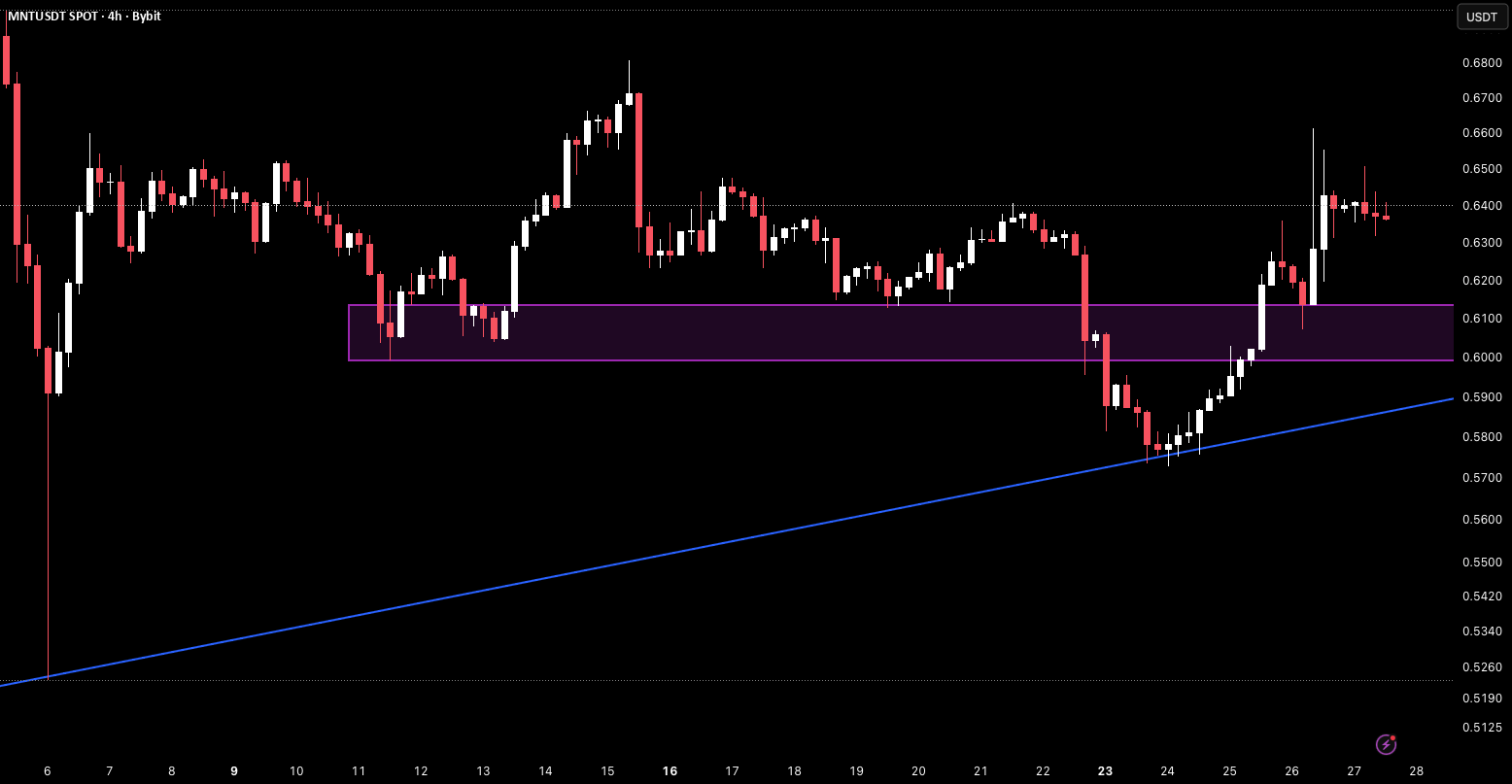 MNT ha successivamente eliminato i long tardivi prima di riconquistare la zona $0.60–$0.61. Quest'area è ora passata da un mal di testa a una solida fondazione.