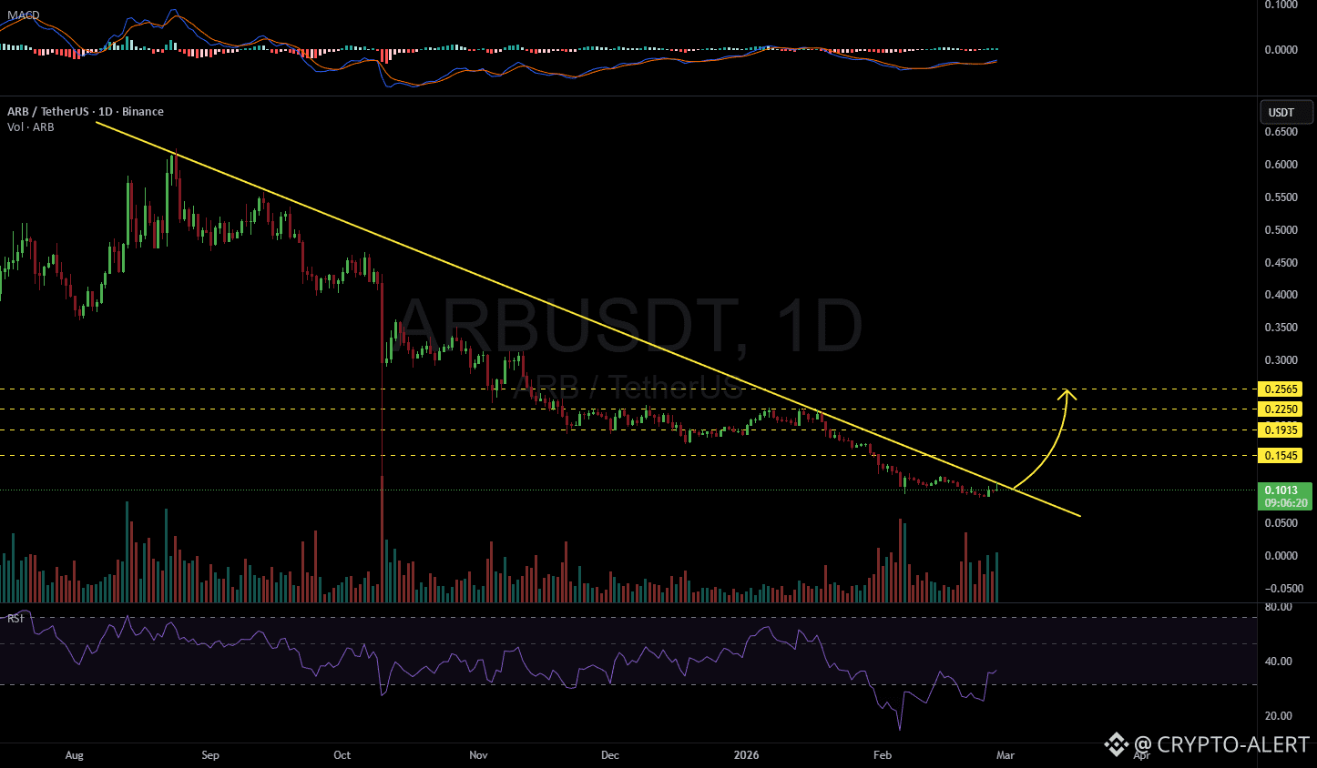 The wait might be almost over. Arbitrum $ARB is currently trading at $0.1014 (+4.96%) and is sitting right on the edge of a massive technical shift. After months of downward pressure, the price is on the verge of breaking out above a long-term descending resistance on the daily chart. ๐๐