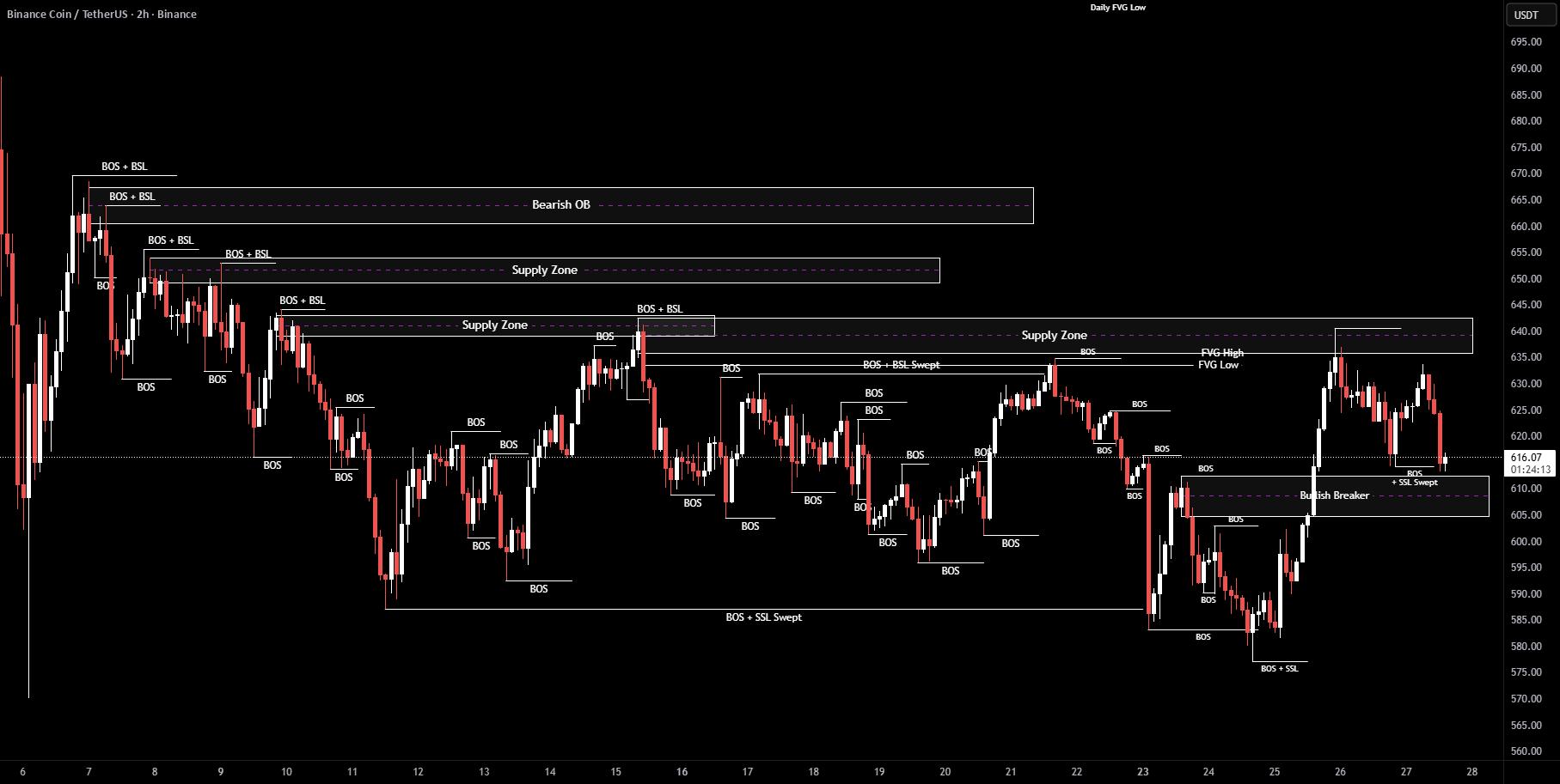 $BNB The 2H chart for BNB/USDT is flashing some critical levels. After a rejection from the supply zone, we've seen a liquidity sweep at $613.30. Currently trading around $616.00, BNB is at a major crossroads.