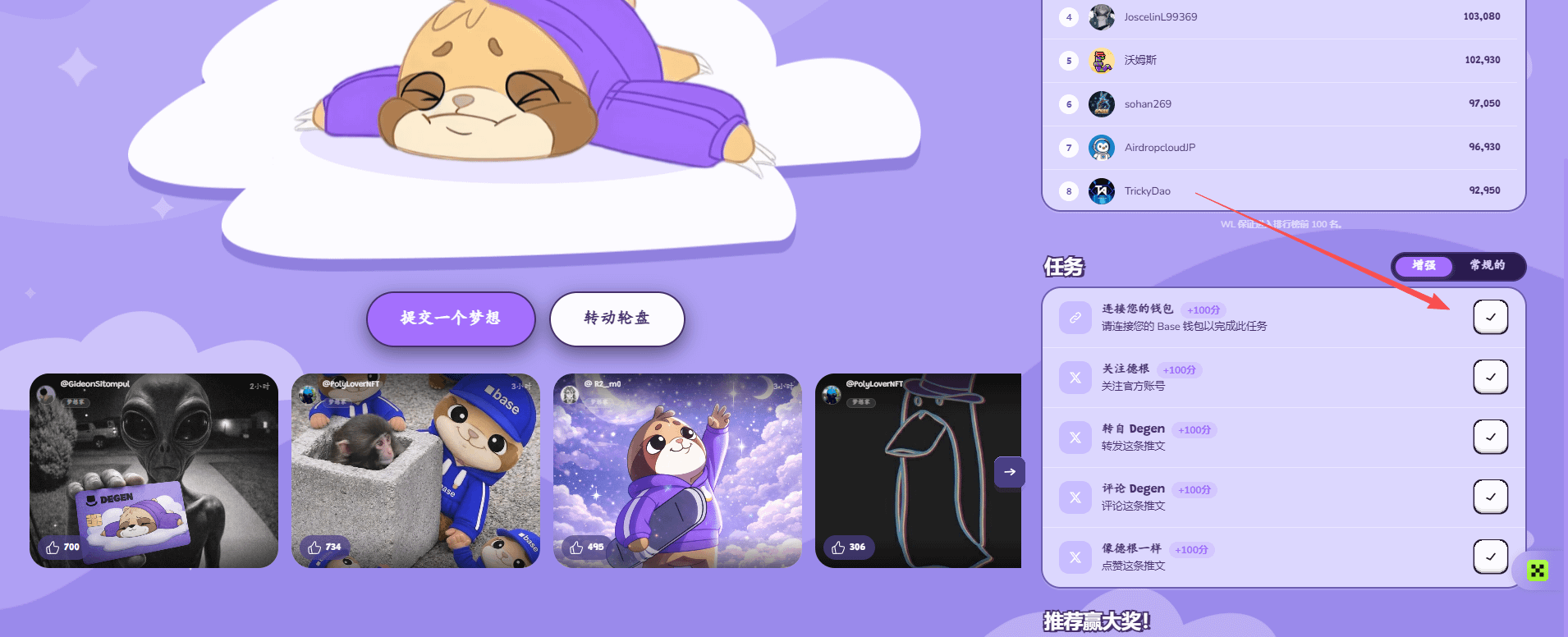 Ci sono un totale di 777 NFT gratuiti, con 3 metodi per ottenerli, il primo è detenere oltre 1 milione di token DEGEN per 30 giorni. Garantito per entrare nella whitelist. Limitato ai primi 250 membri. Ho visto che 1 milione vale circa 70 USD con variazioni, non avere paura di spendere per detenere per 30 giorni, e solo chi è nei primi 250 può farlo!