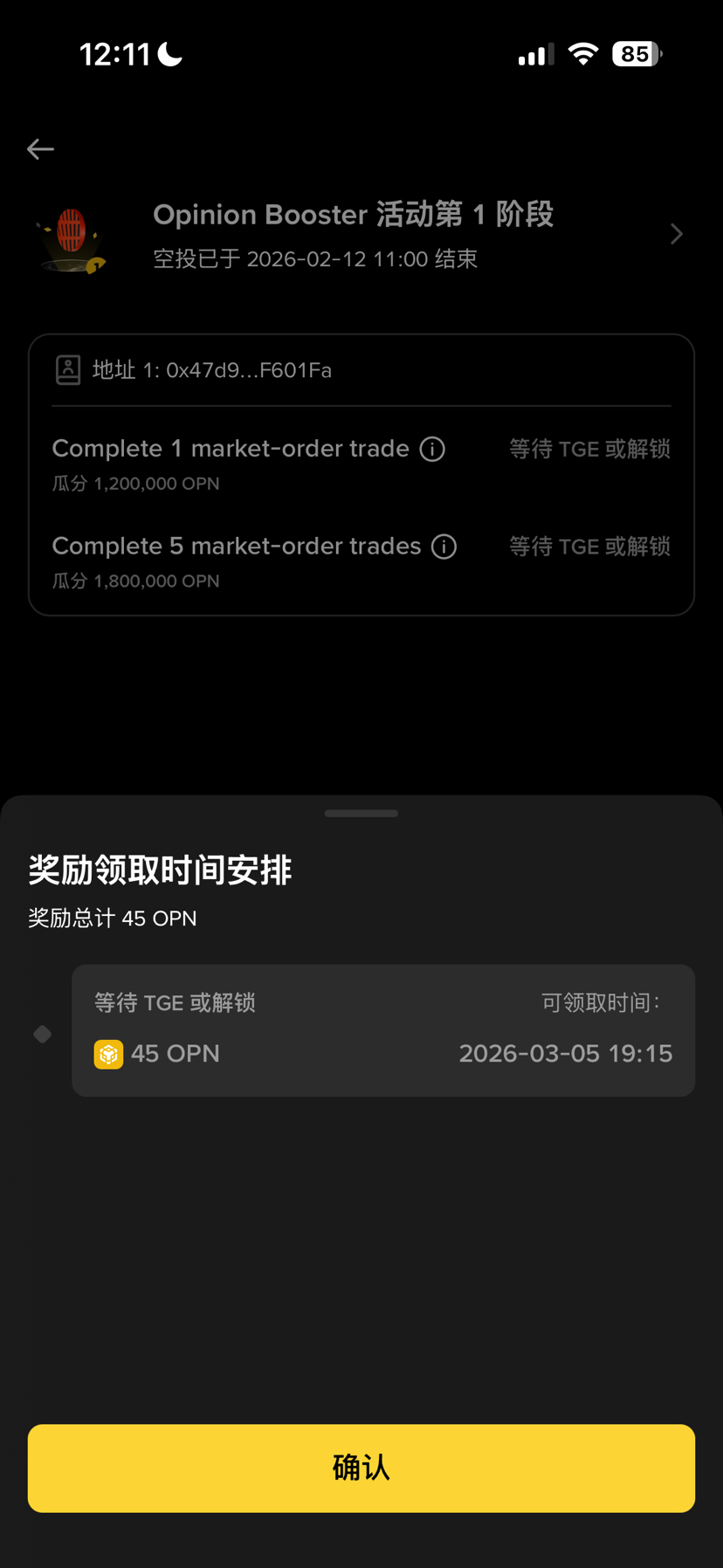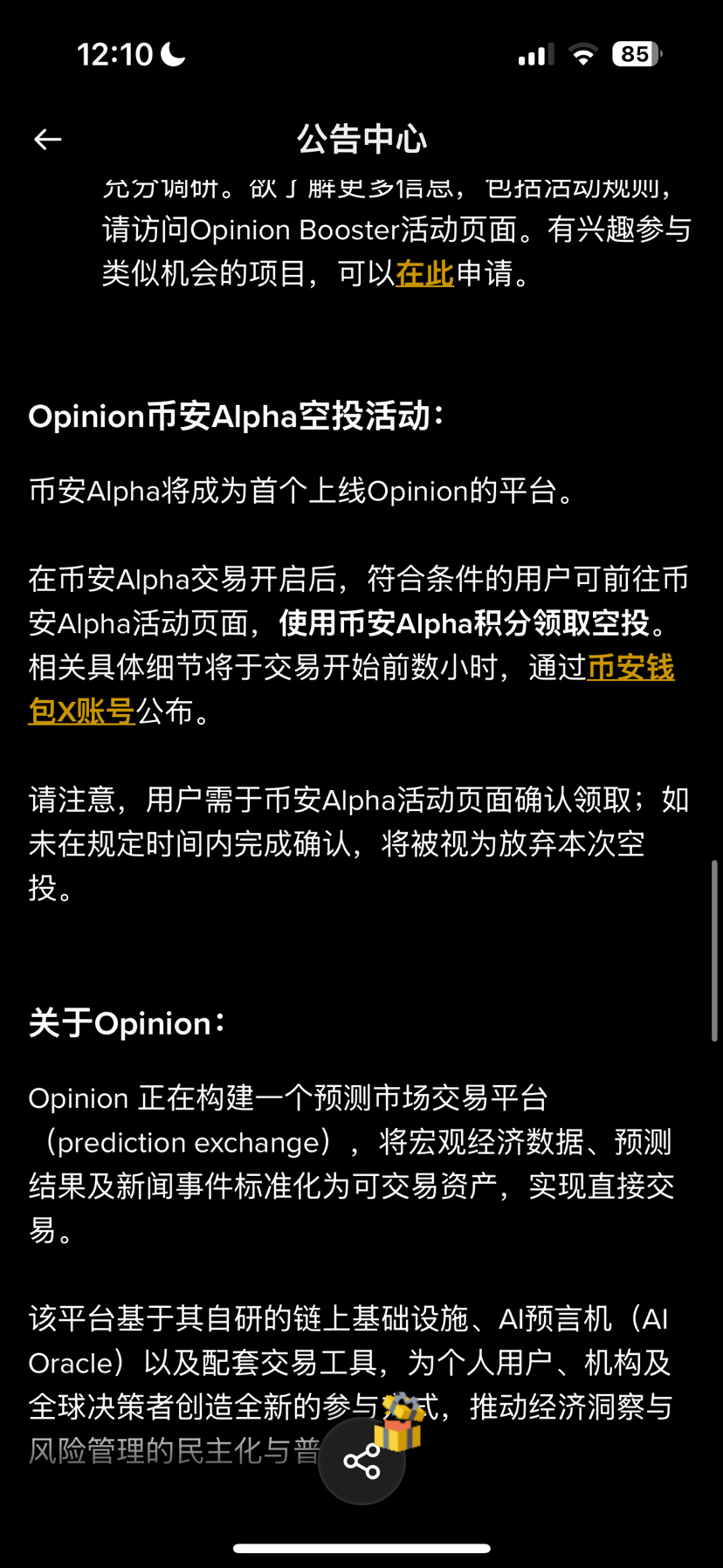 兄弟们,刚才咱们吐槽了某些坑爹的 Booster 活动,但这次结合公告来看,币安 Alpha 首发上线的 Opinion (OPN) 完全不是一个画风。同样是消耗 5 个积分,这波的性价比极高,绝对值得拿放大镜盘一盘。