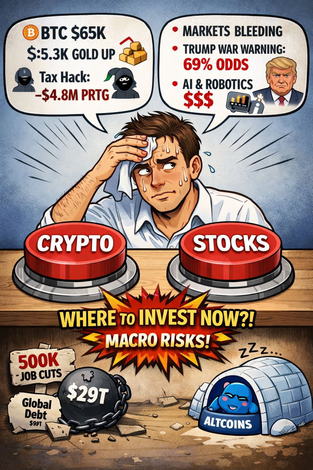 • Gold surged to near $5,300, U.S. equities continued to trade deep in the red, Bitcoin retreated to $65,000, while altcoins remain largely “in hibernation.”