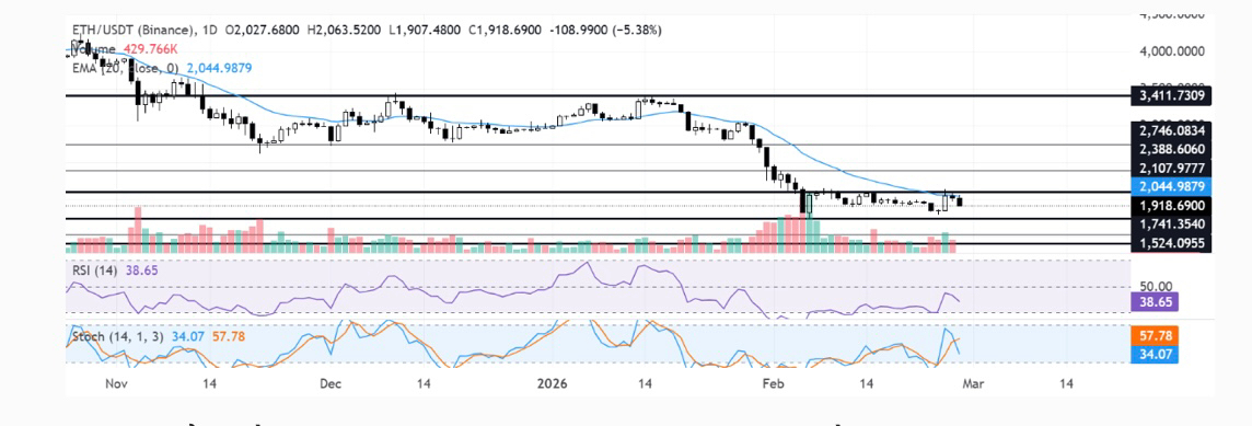 Ở thời điểm hiện tại, ETH đang giao dịch quanh 1.920 USD, giảm hơn 5% trong vòng 24 giờ, cho thấy tâm lý thận trọng vẫn bao trùm thị trường.