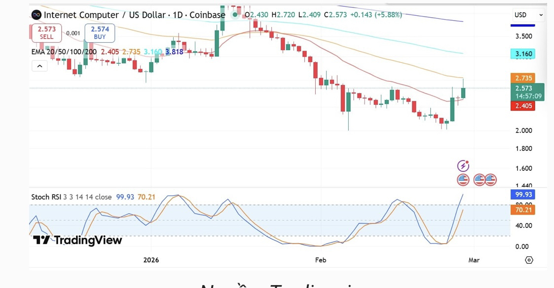 Hiện tại, ICP đang kiểm tra đường trung bình động EMA50 tại mức $2,7. Nếu đồng tiền này có thể đóng cửa hàng ngày trên ngưỡng này, khả năng cao là ICP sẽ vượt qua mốc $3 và hướng đến đường EMA100 tại $3,1.