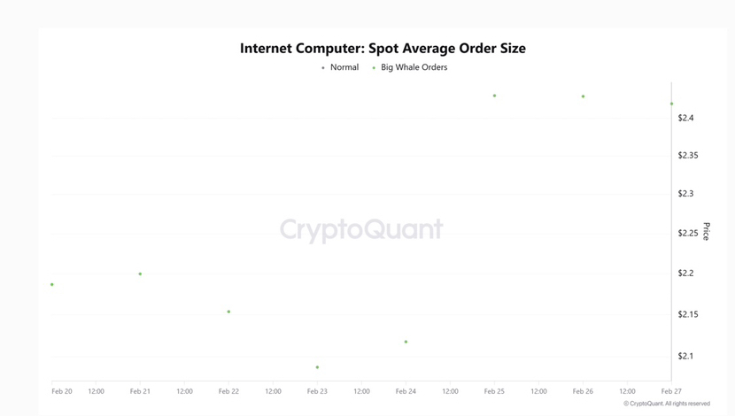 Dữ liệu từ Cryptoquant về “Spot Average Order Size – Kích thước Lệnh Trung bình Giao dịch Giao ngay ” đã chỉ ra sự gia tăng đáng kể trong các lệnh mua lớn tại mức $2,4. Phân tích cho thấy cá voi đã tăng cường hoạt động giao dịch tại mức giá này trong ba ngày qua. Đặc biệt, khi giá ICP giảm xuống $2,3, các cá voi đã tích cực bảo vệ mức này.