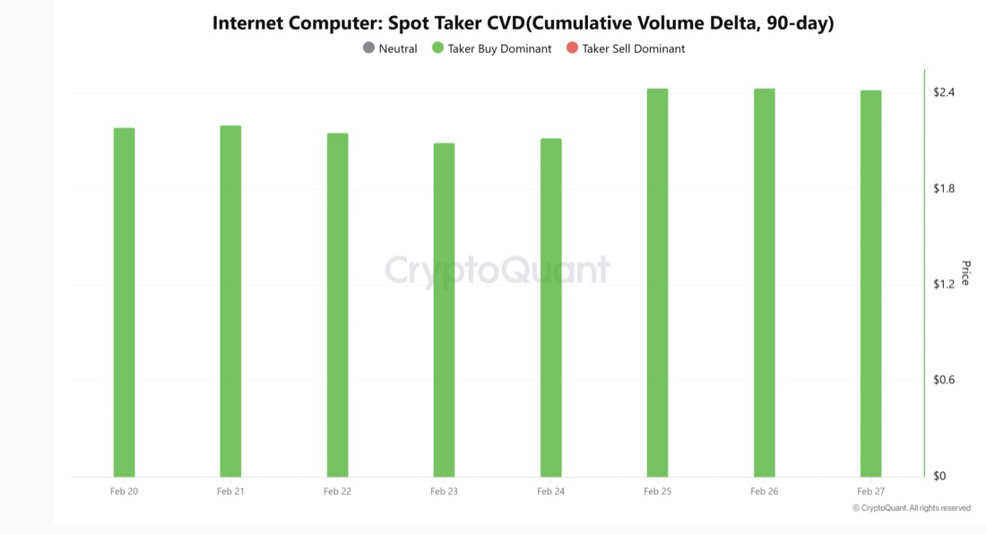 Song song đó, nhu cầu trên thị trường giao ngay (Spot) cũng tăng trở lại, được thể hiện qua chỉ số “Spot Taker CVD”. Chỉ số này cho thấy người mua chiếm ưu thế tại mức $2,4, một dấu hiệu rõ ràng cho thấy các giao dịch mua lớn – chủ yếu từ cá voi – đã diễn ra tại đây.