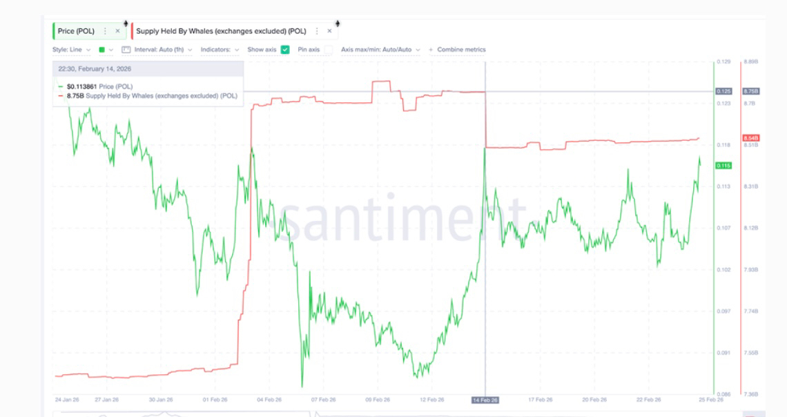 Vào ngày 14/2, các ví cá voi nắm giữ tổng cộng 8,75 tỷ POL. Tuy nhiên, đến ngày 25/2, con số này giảm xuống chỉ còn 8,54 tỷ POL – tương đương 210 triệu POL đã bị bán ra. Điều này cho thấy các cá voi đã tận dụng đợt tăng giá để chốt lời hoặc thoát vị thế.