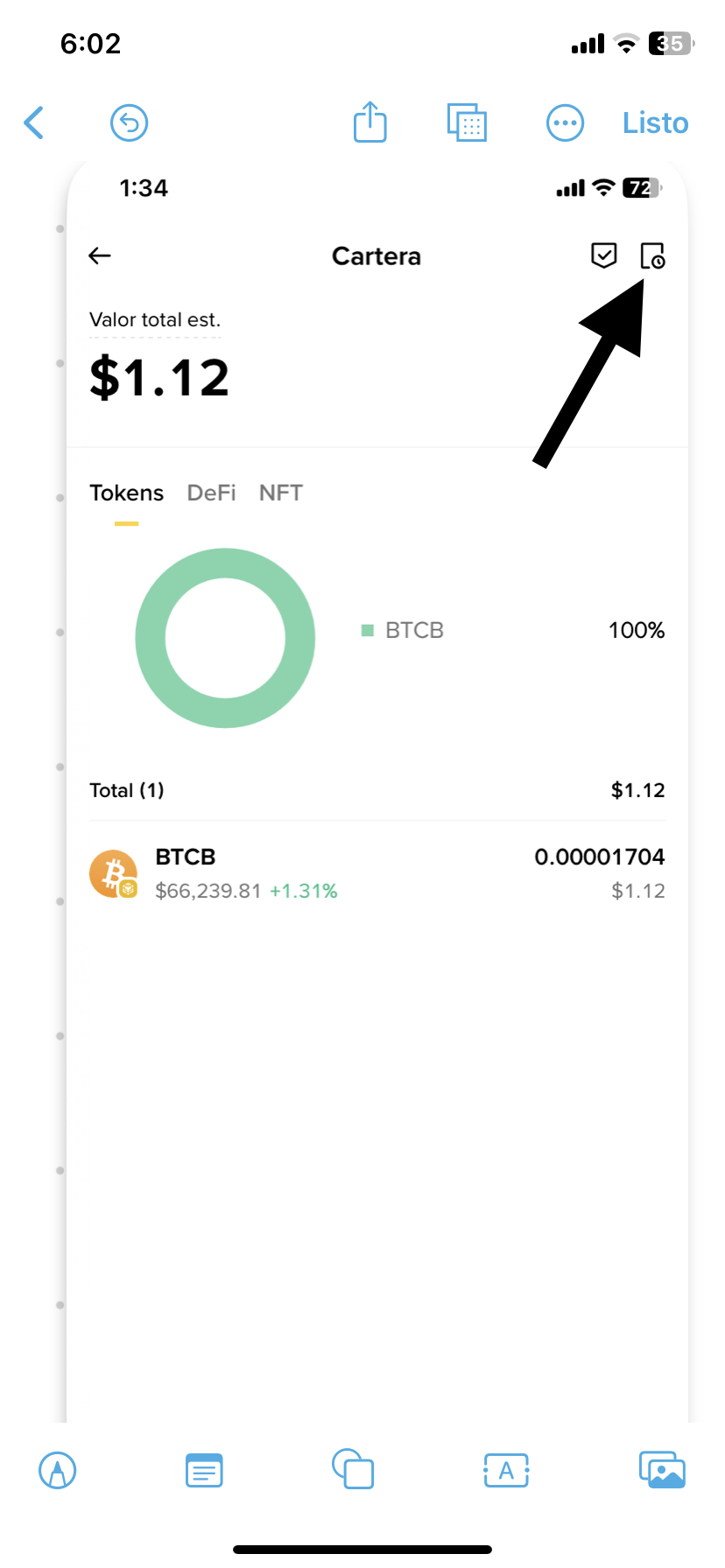 Selecciona Cartera, en la imagen 2 te lleva al historial de transacciones, toca donde dice recibir, aparece otra pantalla donde aparecen primero la dirección de tu billetera del exchange y despues la dirección de tu billetera Hot Wallet de Binance ese número tienes que aprender a conocerlo muy bien es como tu cuenta de banco, personal y no se cambia, y debajo puedes ver la comisión de red que se paga en BNB, cada red cobra comisiones en su token nativo.