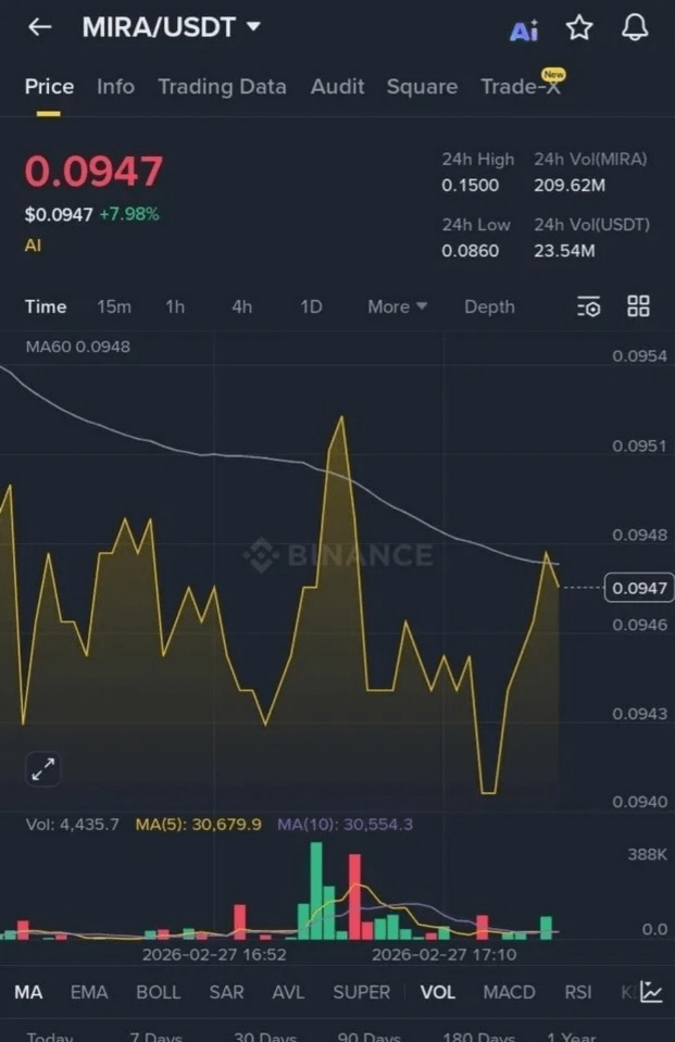 From a market standpoint, $MIRA currently reflects measurable engagement, with an estimated market capitalization around 33 Million USD and a 24-hour trading volume near 10 Million USD. This level of liquidity relative to its size indicates active participation and consistent trading activity.